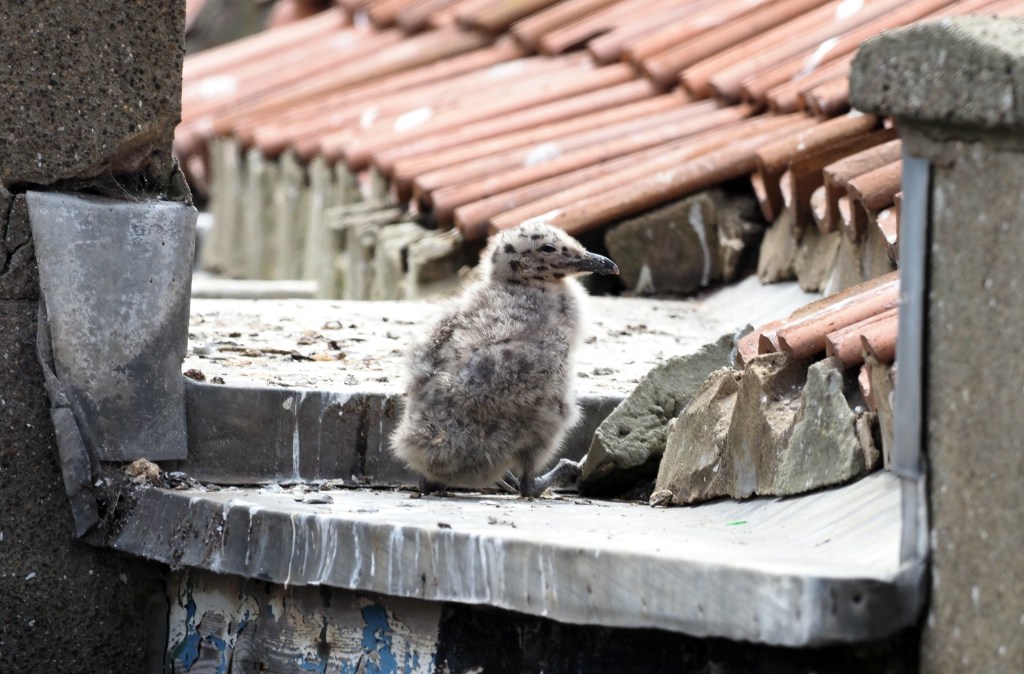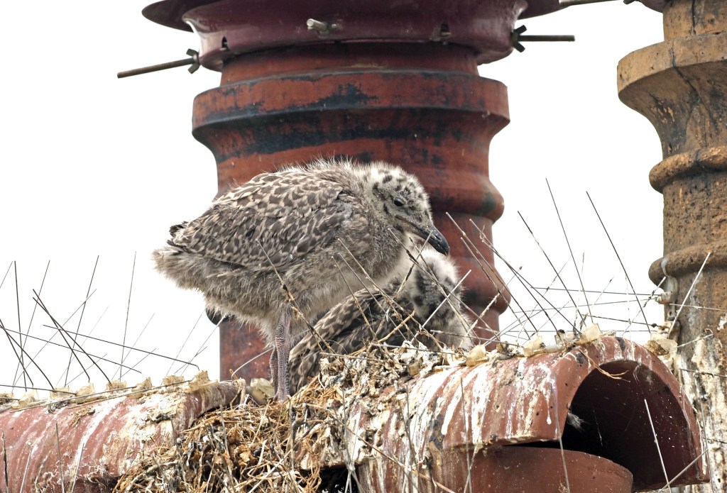 I wrote about this before (Silly seabird season! Herring gull chicks), but I think it is a topic worth revisiting, as everyone who visits seaside towns has an opinion on the ‘sea gulls’. To many residents, nesting Herring gulls (and Kittiwakes) can be a pest, causing a mess, and damage to property. To try and prevent the gulls from nesting, some house holders resort to all sorts of measures, spikes and mesh being the most common. These defences are however, only partially successful, and the gulls seem to be very clever at building nests which mostly avoid the spikes (see below).