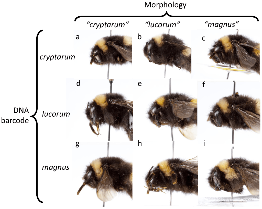 There are many examples of cryptic diversity in bumblebees. For example, the so-called, Bombus lucorum complex, contains three closely related species (Bombus lucorum, B. magnus, and B. cryptarum) that are very similar in colour, and in terms of their male genitalia (Waters et al., 2012). Their status as separate species has however, been confirmed by DNA-based identification methods (i.e. nucleotide sequence data), particularly the use of COI barcoding. There have been some suggestions that the queens of these three bumblebee species can be told apart based on the extent of the yellow collar on the thorax (Bossert, 2014), although other studies have contested this (Carolan et a., 2012). See illustration (below).