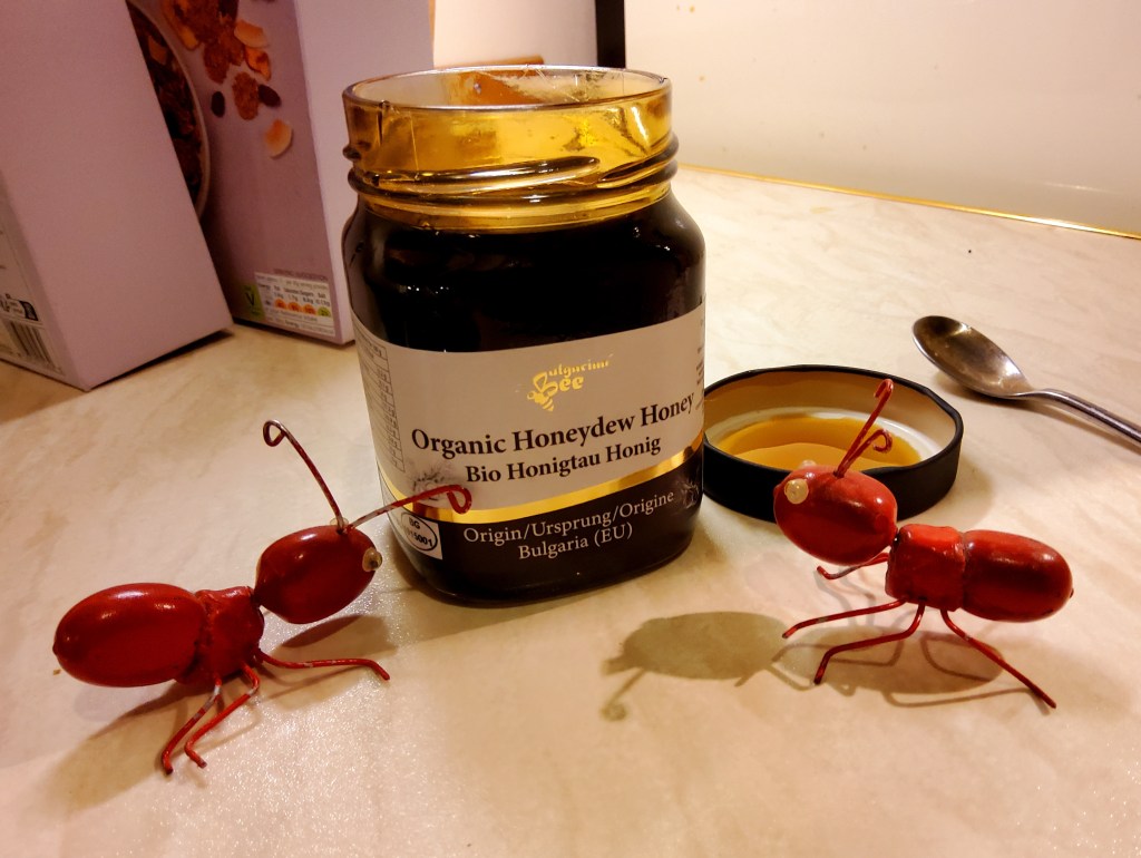 As far as I know, the oak honeydew honey you’ve got here is a bit different. This honeydew is not excreted by aphids but comes from the acorns themselves. They release it in order to seal the channels the acorn weevil (Curculio glandium) chewed into the acorns to deposit its eggs. Anyway, enjoy your honey. 🍯🐝😊