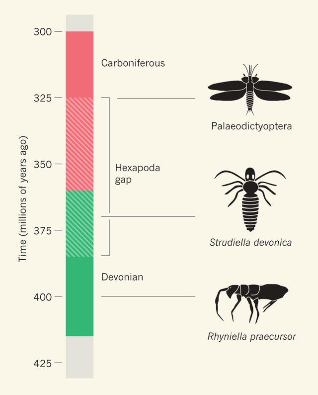 Rhyniella praecursor, which appears similar to extant collembola. But there are very few examples from the period between 385 million and 325 Myr, referred to as the Hexapoda gap (striped region)