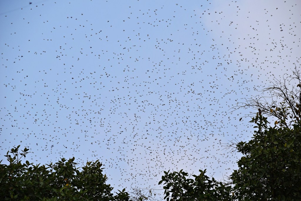 The swarm may be subtly steered towards the new home by the scouts, or more likely, they signal the correct travel direction by repeatedly carrying out high-speed flights through the airborne swarm in the direction of the new home, as originally suggested by Lindauer (1955), and confirmed by later studies. These streaker bees then return to the back of the swarm before making another fast flight, especially through the top of the swarm. The uninformed, follower bees probably ‘latch onto’ the informed, streaker bees ‘by some sort of velocity attraction to the fast-flying bees‘ (Schultz et al., 2008).