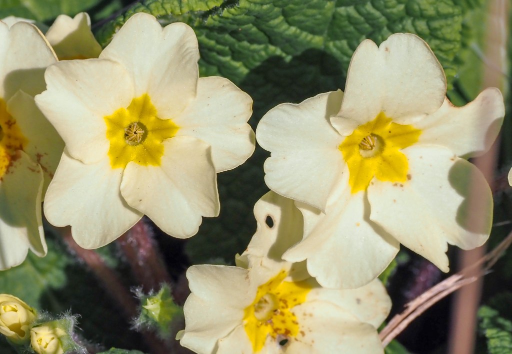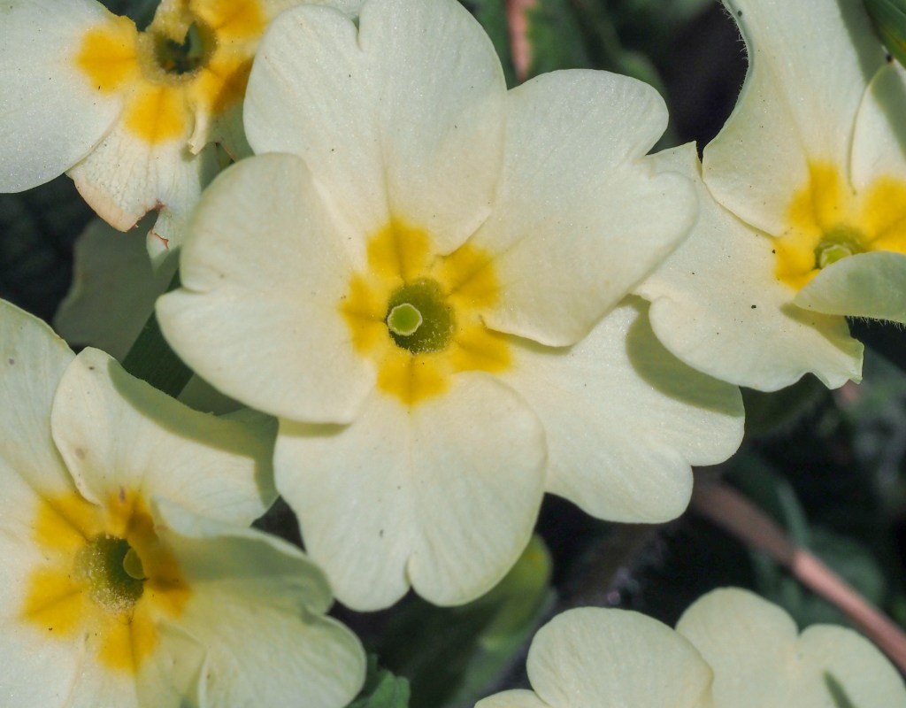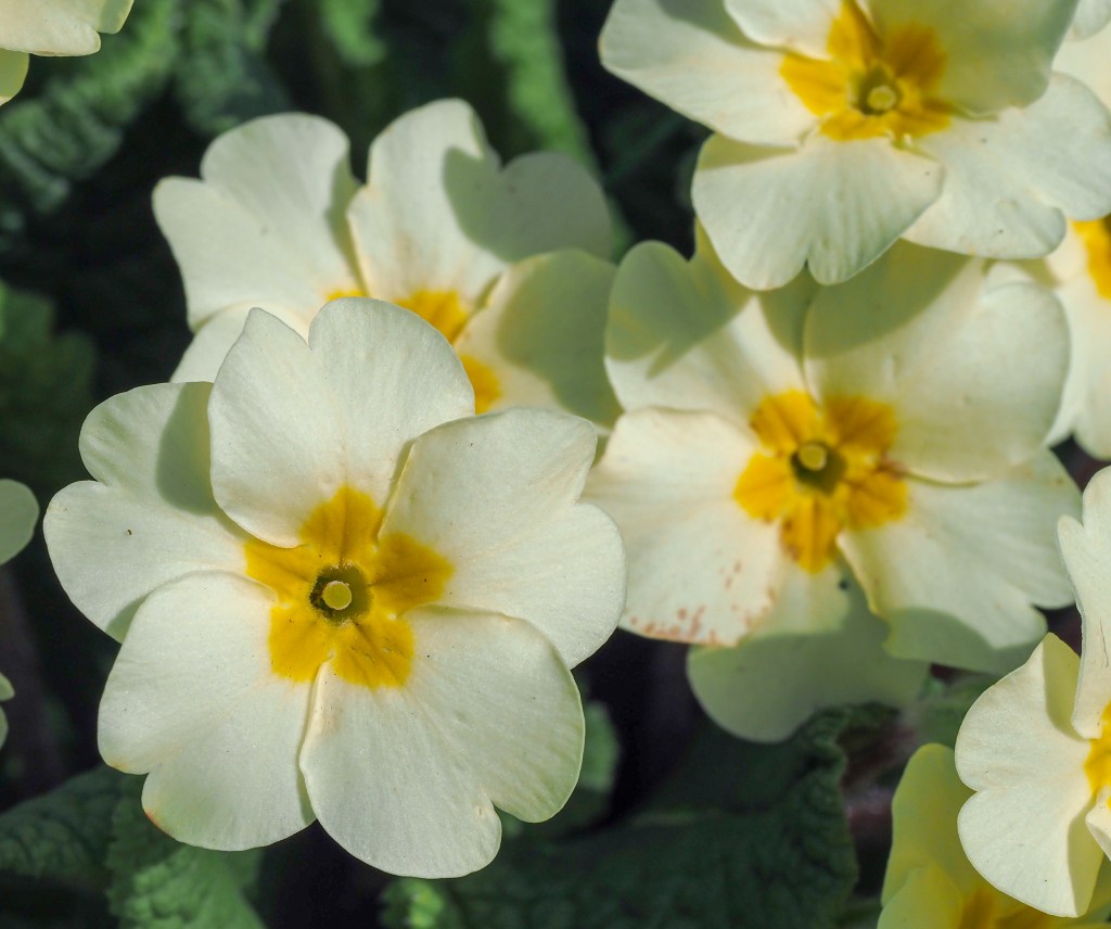 Primroses are in their prime at the moment, brightening up every spring day, come rain or shine, with their colourful, smiling faces. Or so it seems to me!