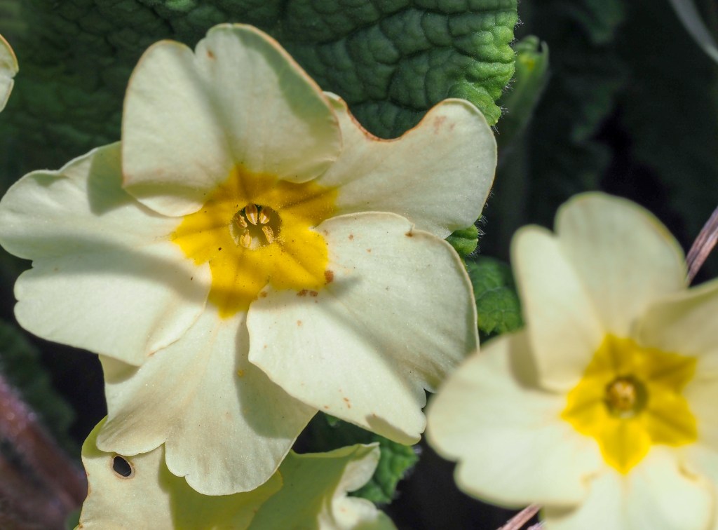 The flowers are hermaphroditic – meaning each flower has both male and female structures, but heterostylous, so individual primrose plants have either pin flowers (where the head of the style is prominent) or thrum flowers (where the stamens are prominent). Fertilisation can only take place between pin and thrum flowers, i.e. between the different morphs. Pin-to-pin and thrum-to-thrum pollination is therefore, ineffective.