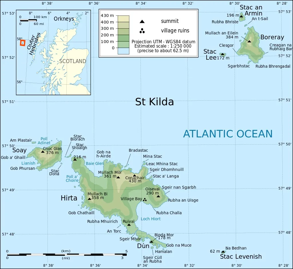 St Kilda is an isolated archipelago situated about 40 miles west of the Outer Hebrides in Scotland. The three main islands, of which the largest is Hirta, are the remains of an ancient volcano which blew its top about 55 million years ago. The other main islands are Soay and Boreray.