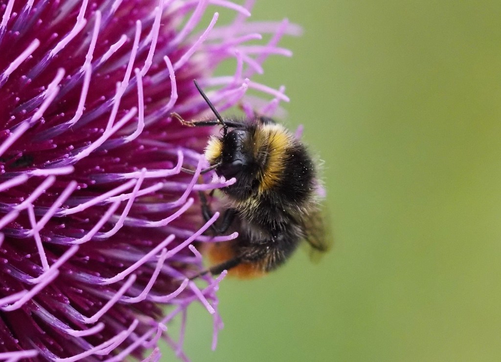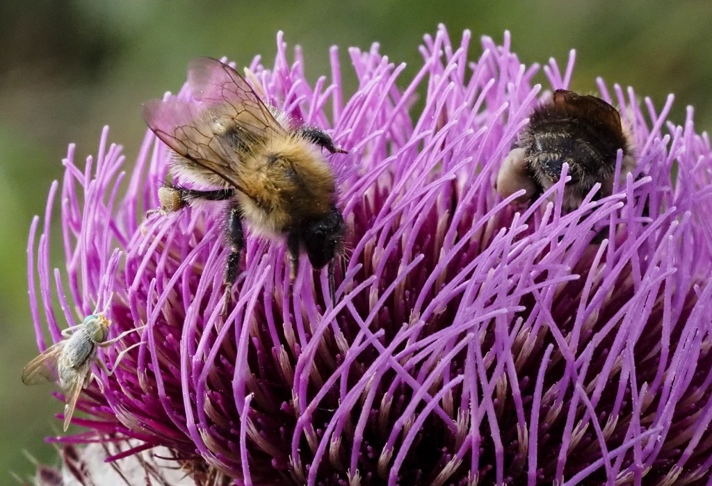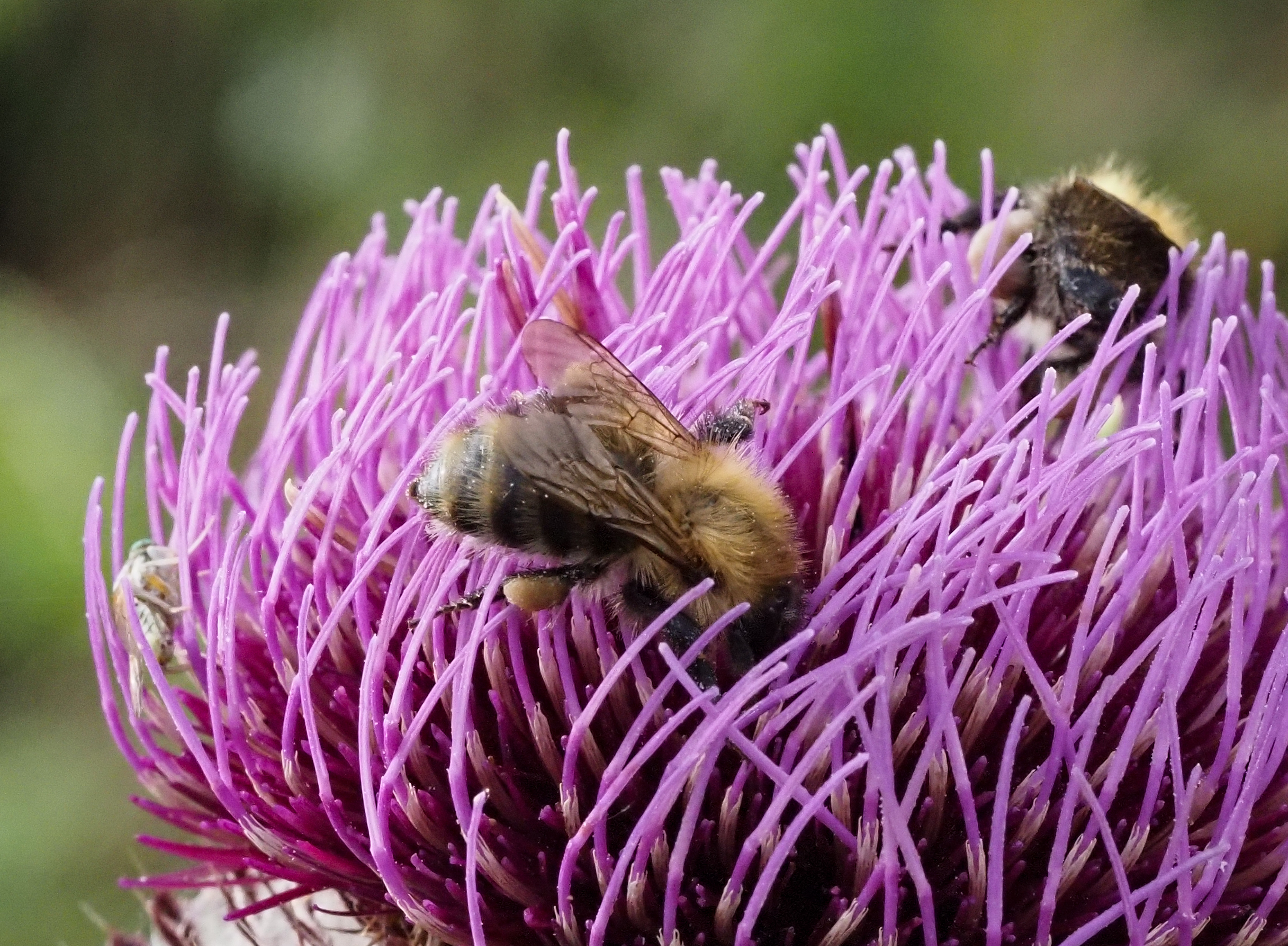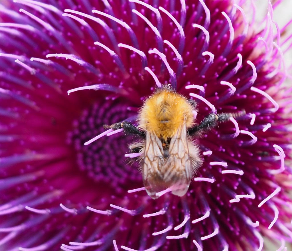 There was plenty of room for a couple of bees to share a flower head, but sometimes the presence of another worker seemed to put off a newly arriving bee. This carder bee worker (below) briefly alighted on top of another individual – just a light touch – before flying off!