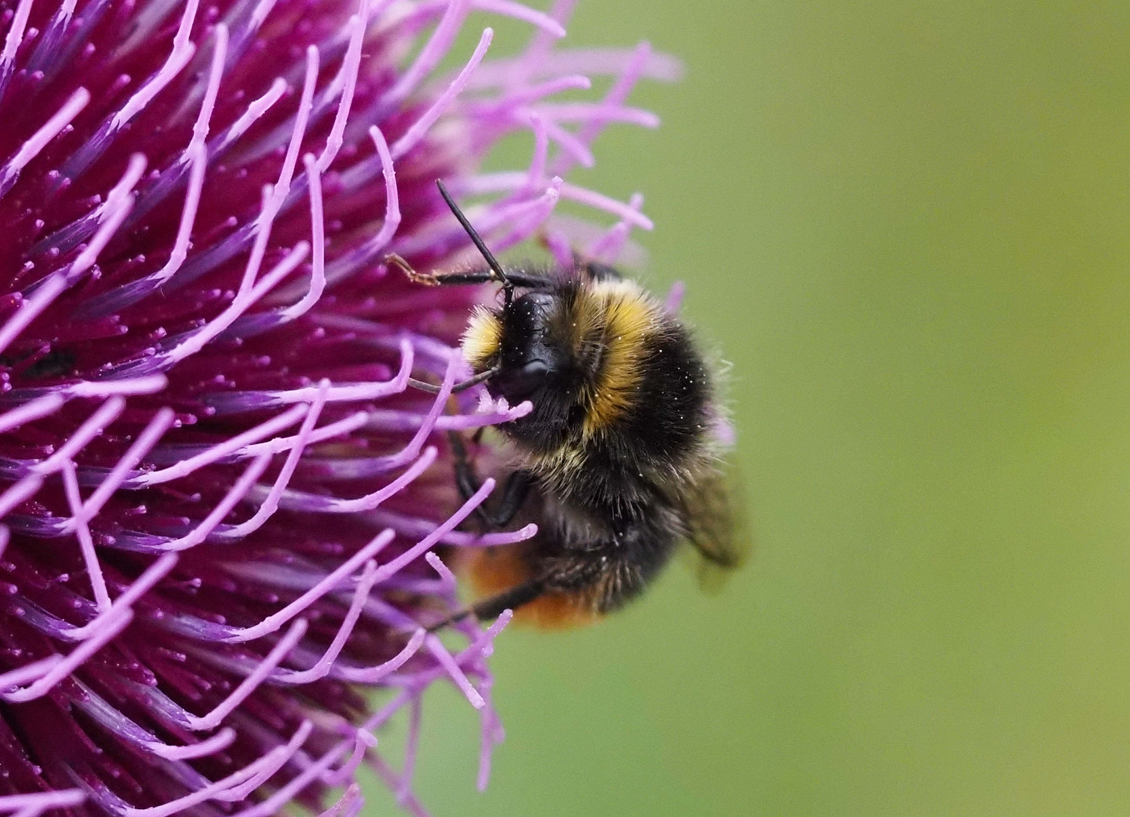 Bumblebees can be tricky to tell apart sometimes, but I think the one below, is a Red-tailed bumblebee (Bombus lapidarius) male, because of the tufts of yellow facial hairs, and the absence of yellow hairs at the top of thorax; but it is possible that it might be an Early bumblebee (Bombus pratorum) worker?