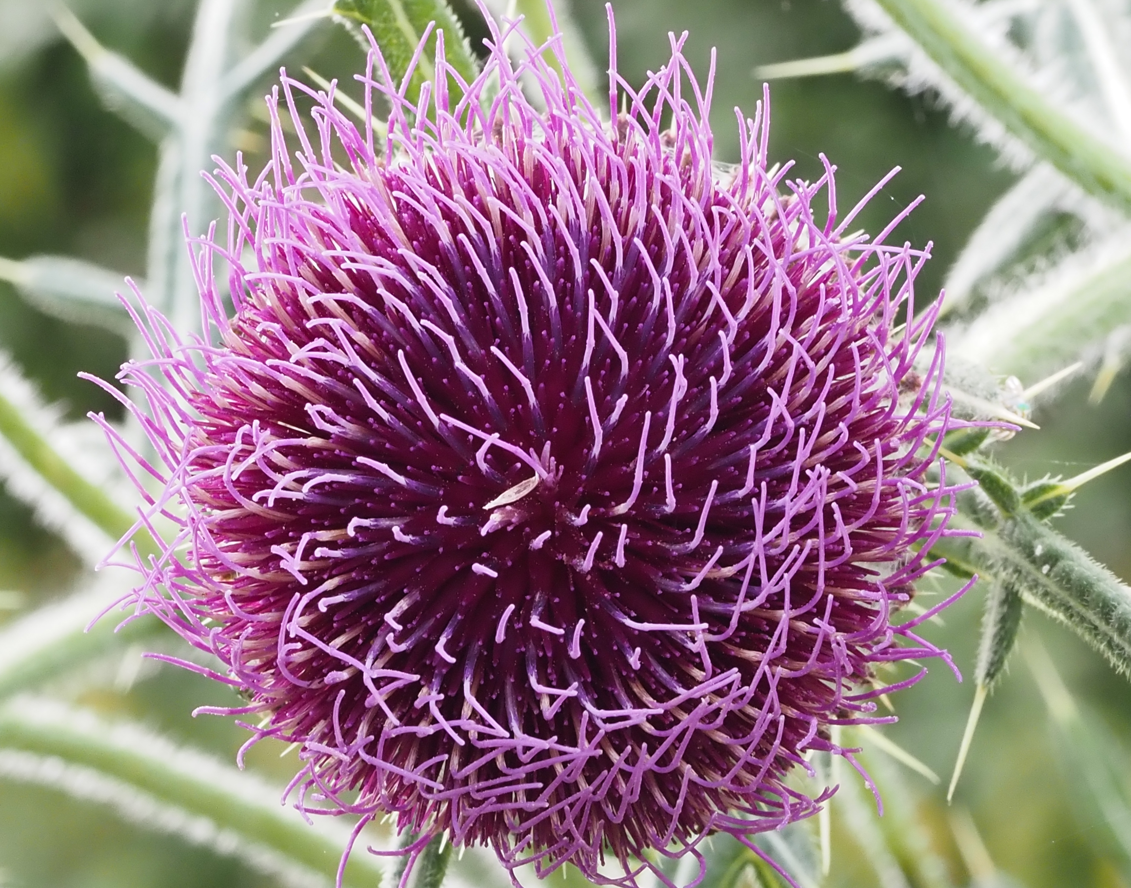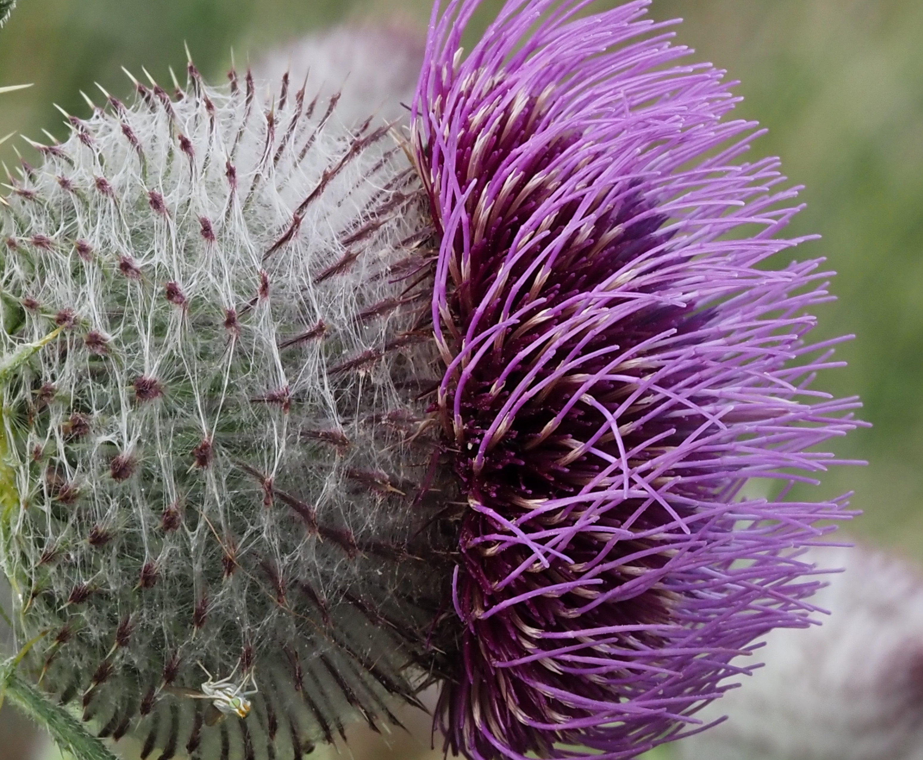 The tiny florets on top of the flower head emerge from spiny bracts. The numerous narrow, spiny bracts below the florets are angled outwards and the space between them is filled with dense cobwebby hairs (below left).