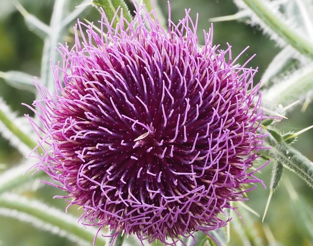 Woolly thistles (Cirsium eriophorum) have large globular flowers – strictly speaking they are an inflorescence – which are covered with dense purple ‘hairs’. Before the flower heads open (below left) they have an attractive pattern of bracts arranged in Fibonacci spirals. The flowers contain many tubular florets, with long reddish-purple tubes and lighter purple stamens (below right).