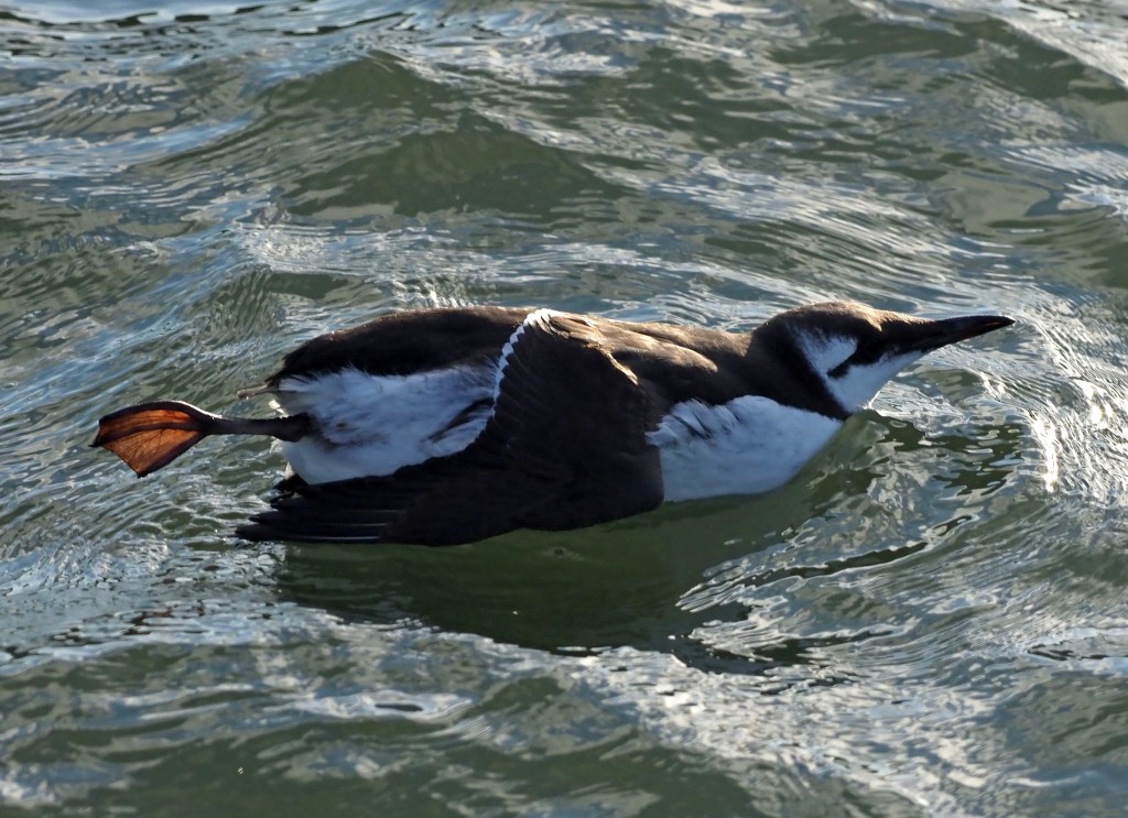 Guillemots sometimes stretch one of their legs, just one at a time, out backwards (see below), I suppose they need a rest from constantly paddling!