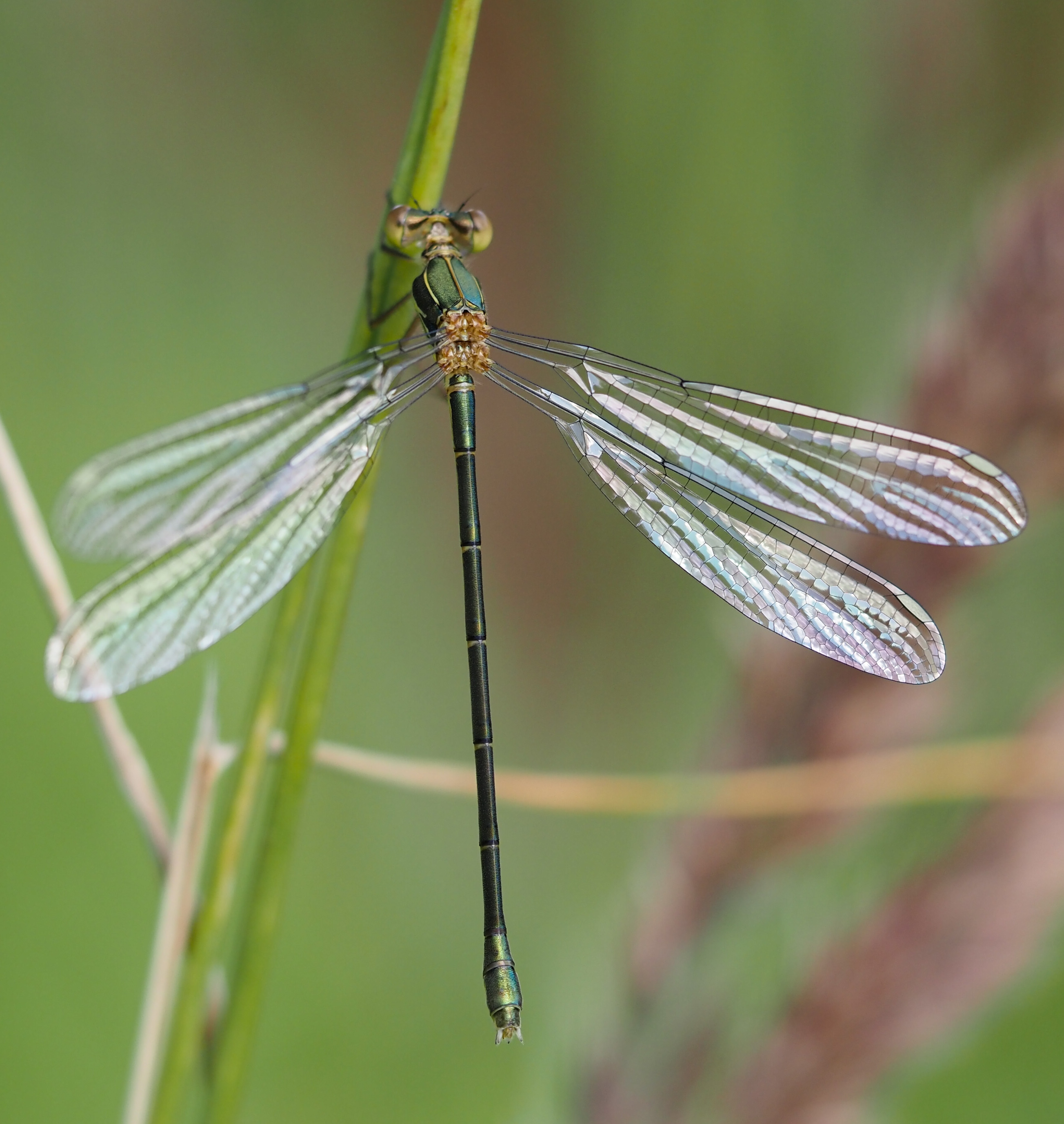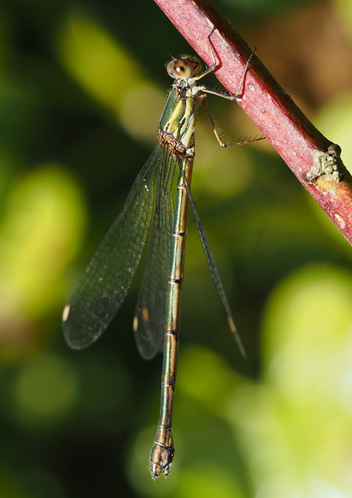 Like other members of the family Lestidae, Willow Emerald damselflies hold their narrow wings at about 45 degrees to the body when resting (see below). There are three other emerald damselflies in the UK: the Scarce Emerald Damselfly (Lestes dryas), the Emerald Damselfly (Lestes sponsa), and the Southern Emerald Damselfly (Lestes barbarus).