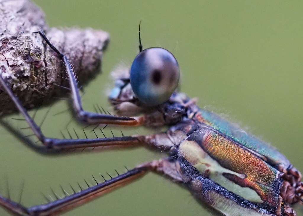 One of the easiest ways of ways of distinguishing a willow emerald is by the large spur-shaped, dark green mark on the side of the thorax (below). Both males and females have this feature.