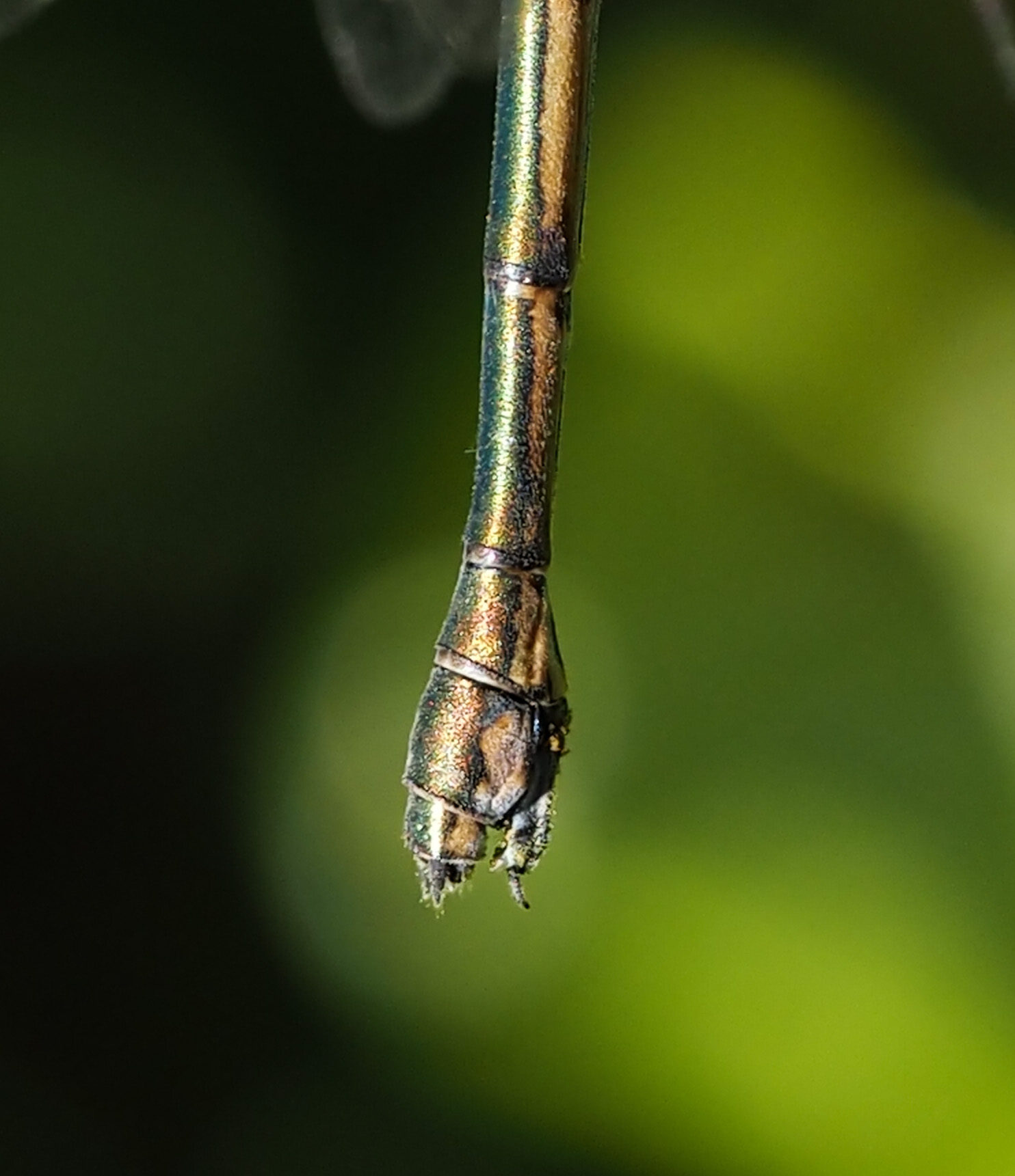 The Willow Emerald Damselfly female lays her eggs into thin, young branches of willow (Salix spp.) and other species of tree such as hawthorn (Crataegus spp.), overhanging water. The eggs overwinter in a state of diapause, then the larvae hatch out in the spring. If the female has got her oviposition right, they fall down into water below the branch where they were laid to continue their development underwater, like other damselflies. The eggs can survive and develop under water, if the tree gets flooded. The females’ ovipositor is fairly dark, with a pale patch on the underside, and is quite chunky in appearance (below). There is what looks like a cutting tool for inserting the eggs beneath the bark of trees.