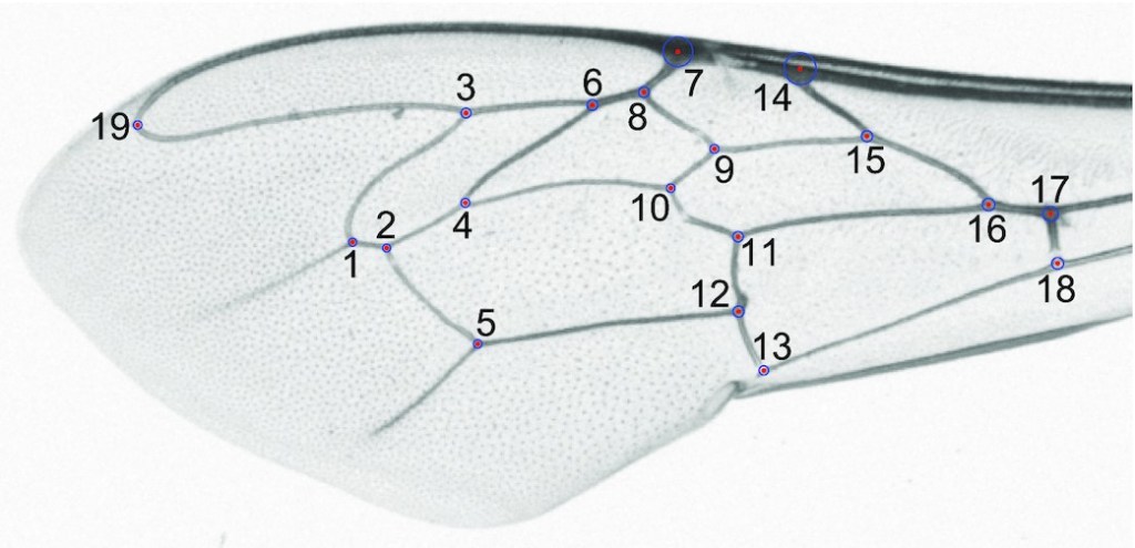 There is quite a large geographic variation in honeybee wing shape in Europe, probably as the result of natural selection. So-called, ‘landmarks’ – at wing vein intersection points – on a honey bee wing can be used to identify the geographic origin of an individual (below).
