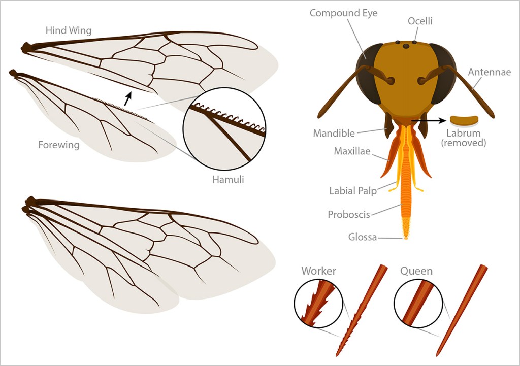 Michels, J., Appel, E., & Gorb, S. N. (2021). Coupling wings with movable hooks–resilin in the wing-interlocking structures of honeybees. Arthropod structure & development, 60, 101008.