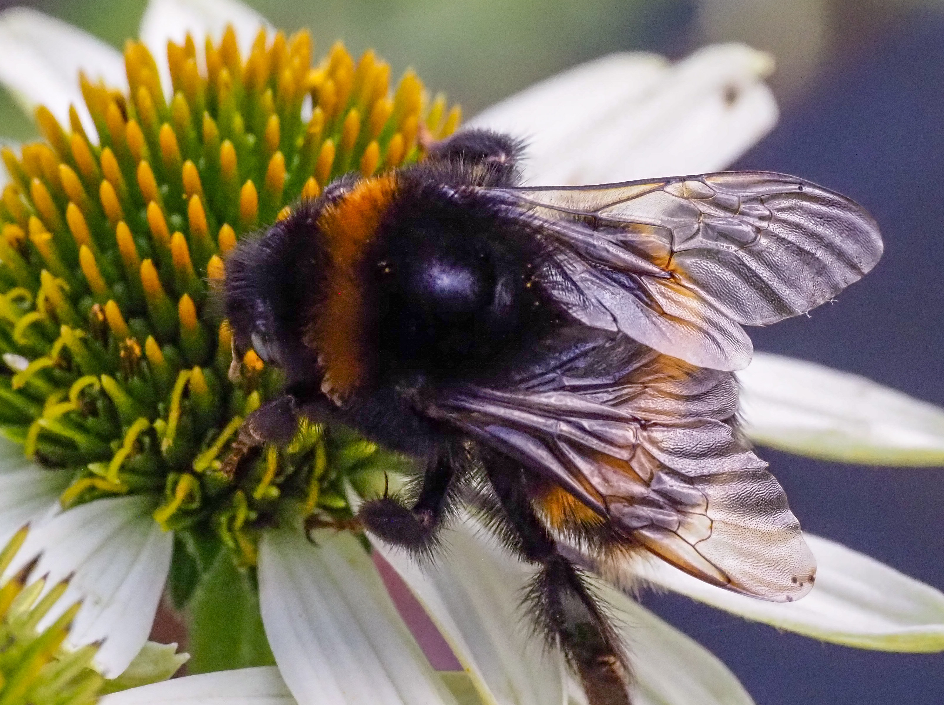 Bees use a row of tiny hooks – called humuli – to attach their front and hind wings together during flight, enabling both wings to move as a single, flexible aerofoil. These hook-like setae are located on the leading edge of the hindwings of most hymenopterans and interlock with a thickened and recurved margin on the trailing edge of the forewing.