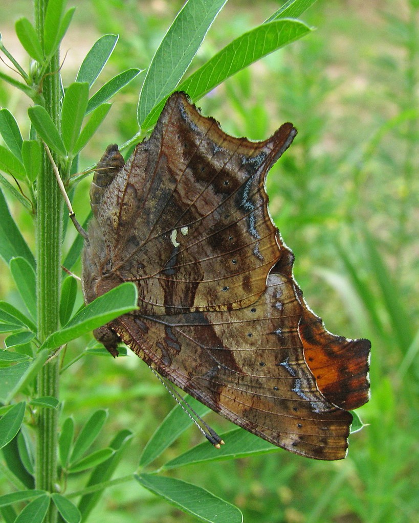 Polygonia butterflies (subfamily Nymphalinae, tribe Nymphalini) are usually referred to as i) commas or ii)  question marks, based on the white punctuation marks on the ventral sides of their hindwings They are also called anglewings because of the pronounced angular shape of their wing margins (see below).