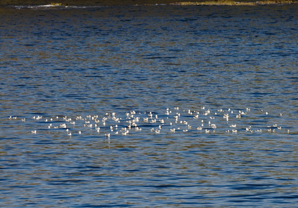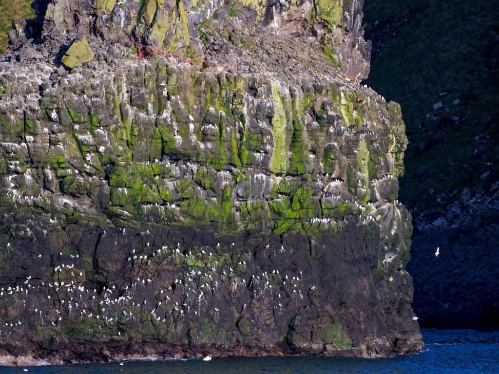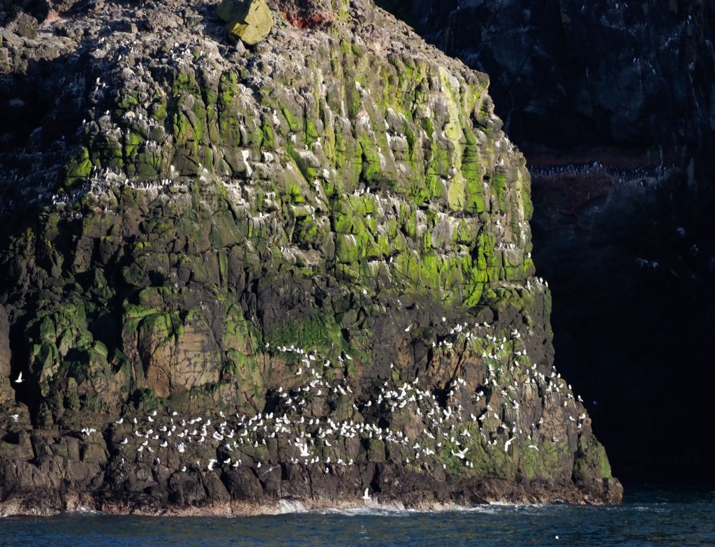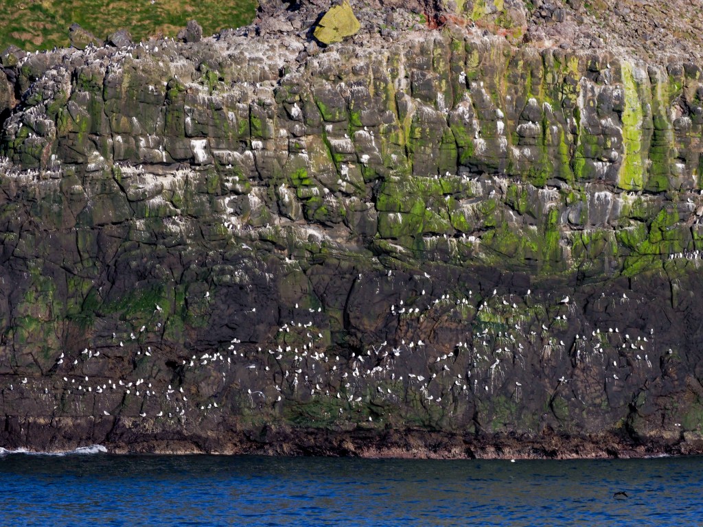 It was possible to see the birds nesting, and resting, on the cliffs, including large flocks of kittiwakes, which were also floating on the water in their characteristic rafts (below).