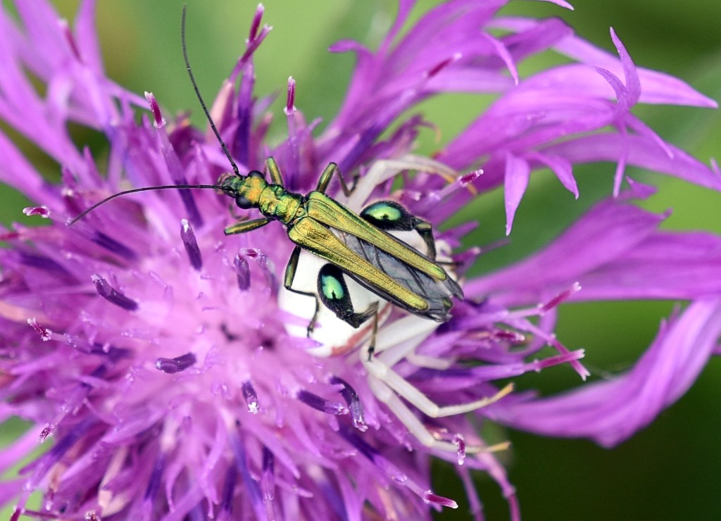 4. Interesting! For some reason, I’m inclined to see “eyes” in the shapes and patterns on insects, and my first thought when seeing your thick-legged flower beetle was that he was oriented facing toward the bottom right corner of the photo – I had mistaken his glossy femurs for glistening eyes, and his “head” appeared quite threateningly large. I wonder if you see this type of “eye” or “face” mimicry in other insects (well, butterflies, of course, but others?)?