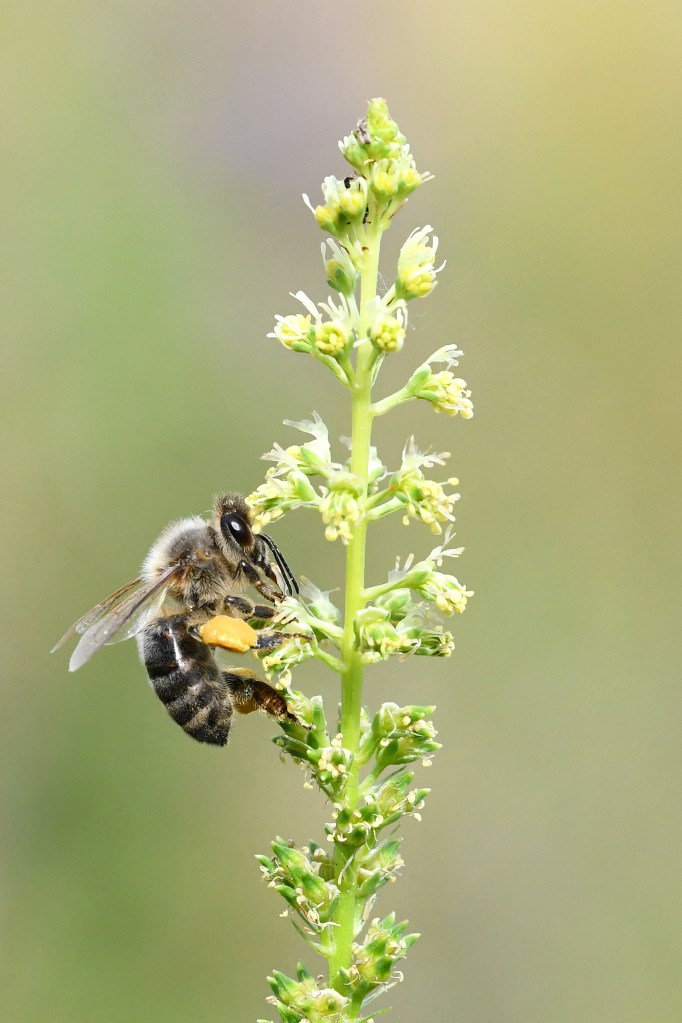 Honey bee (Apis mellifera) with yellow pollen basket on Weld (Reseda luteola)