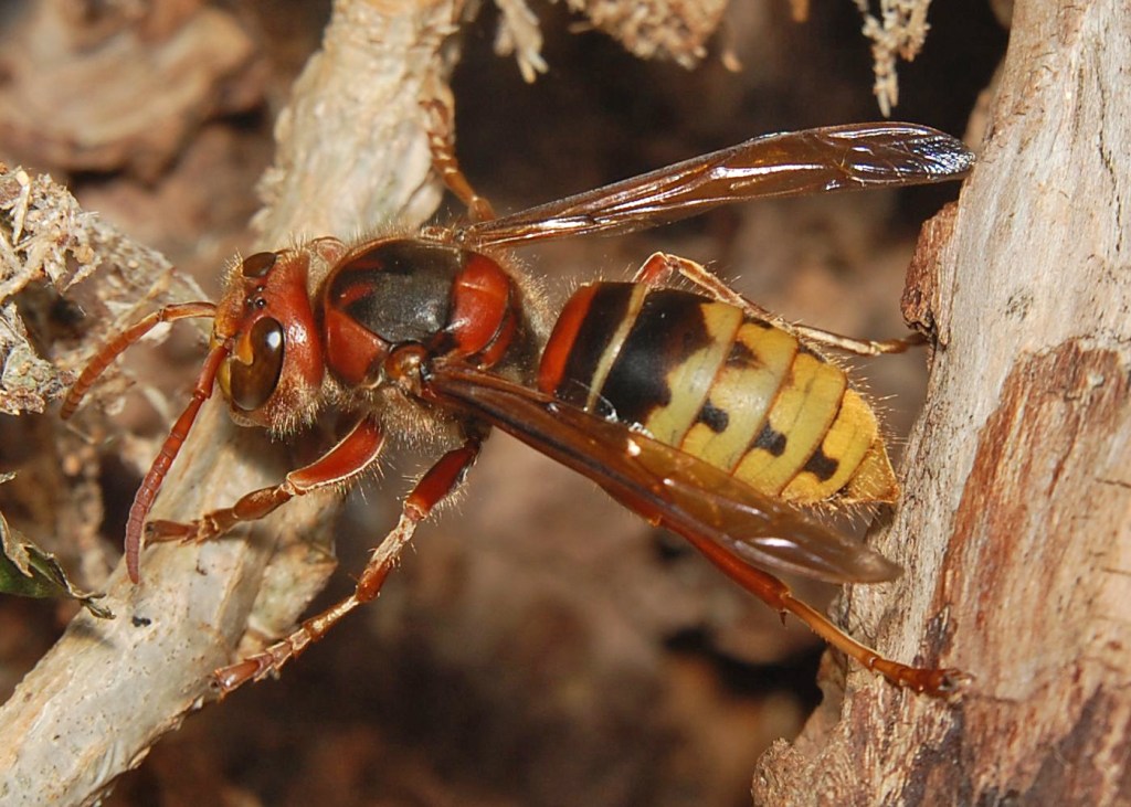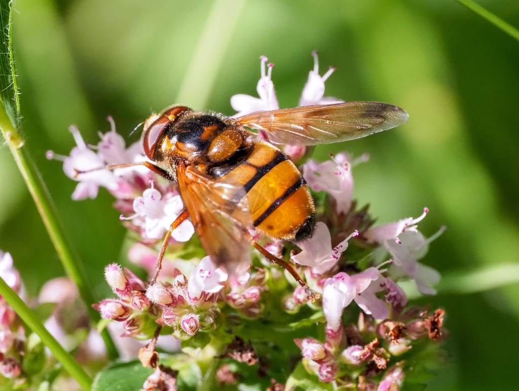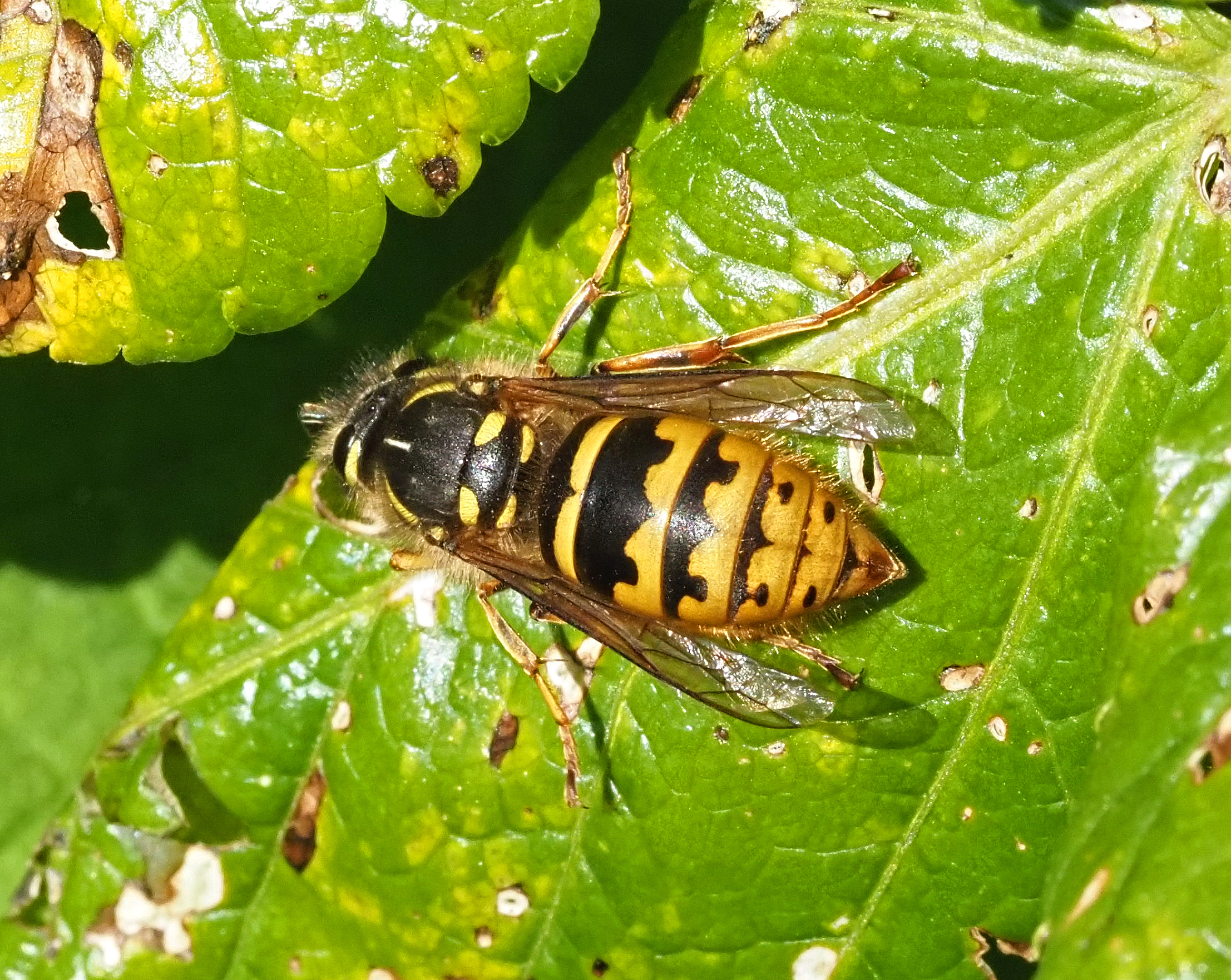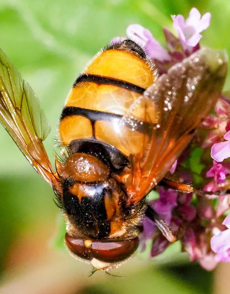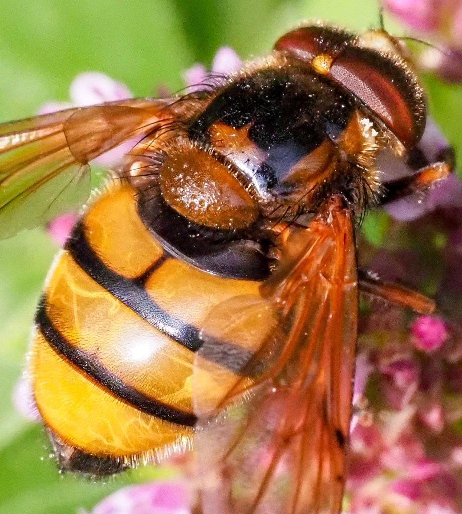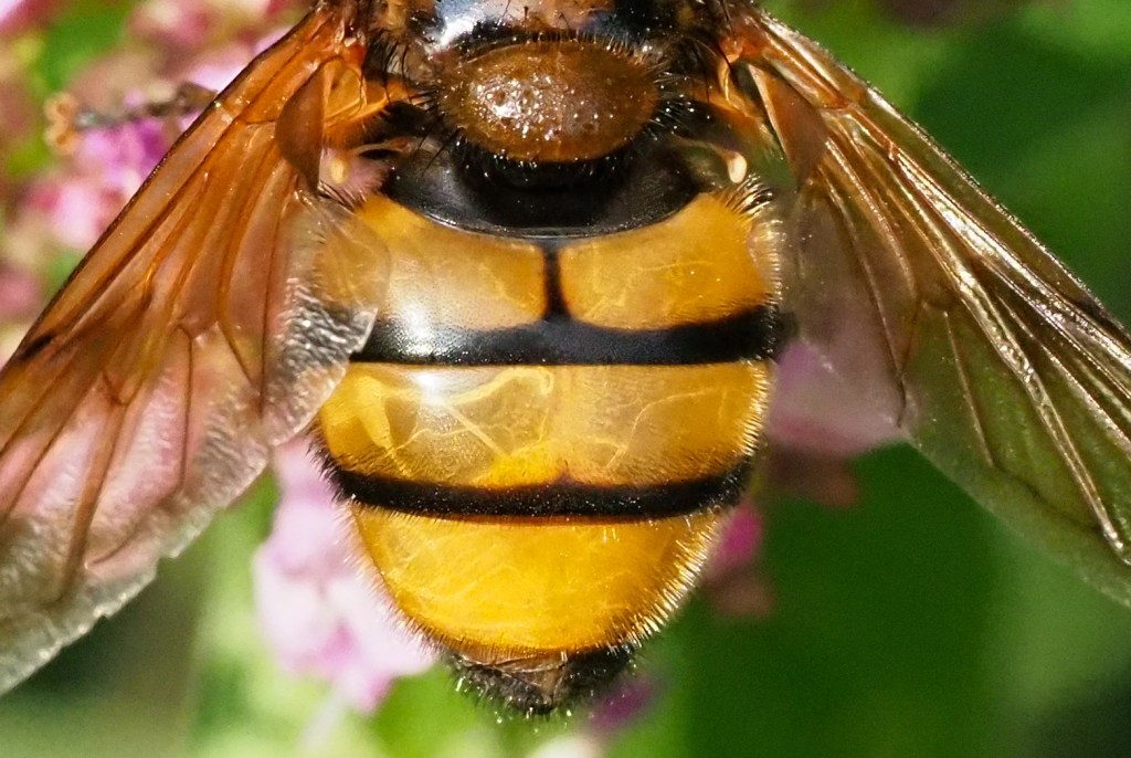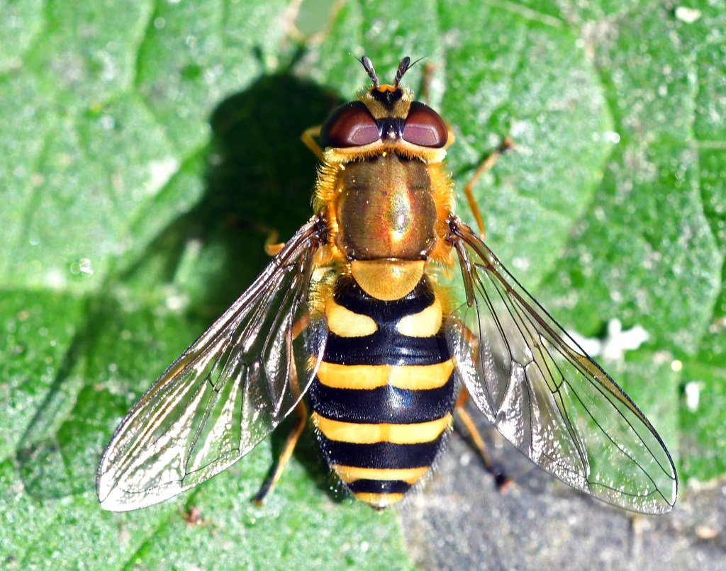 These harmless hoverflies have evolved the approximate appearance of wasps, i.e. they are imitating the warning signals of genuinely harmful species which have powerful stings. Volucella inanis is thought to be a Batesian mimic of both the European hornet (Vespa crabro) and the Common wasp (Vespula vulgaris), shown below. But, they don’t look very much like them, do they!