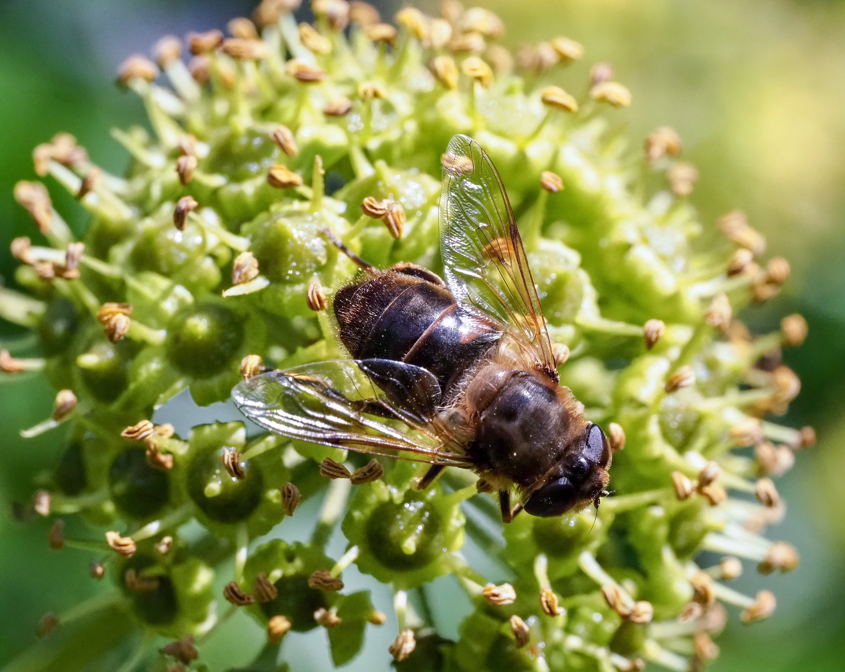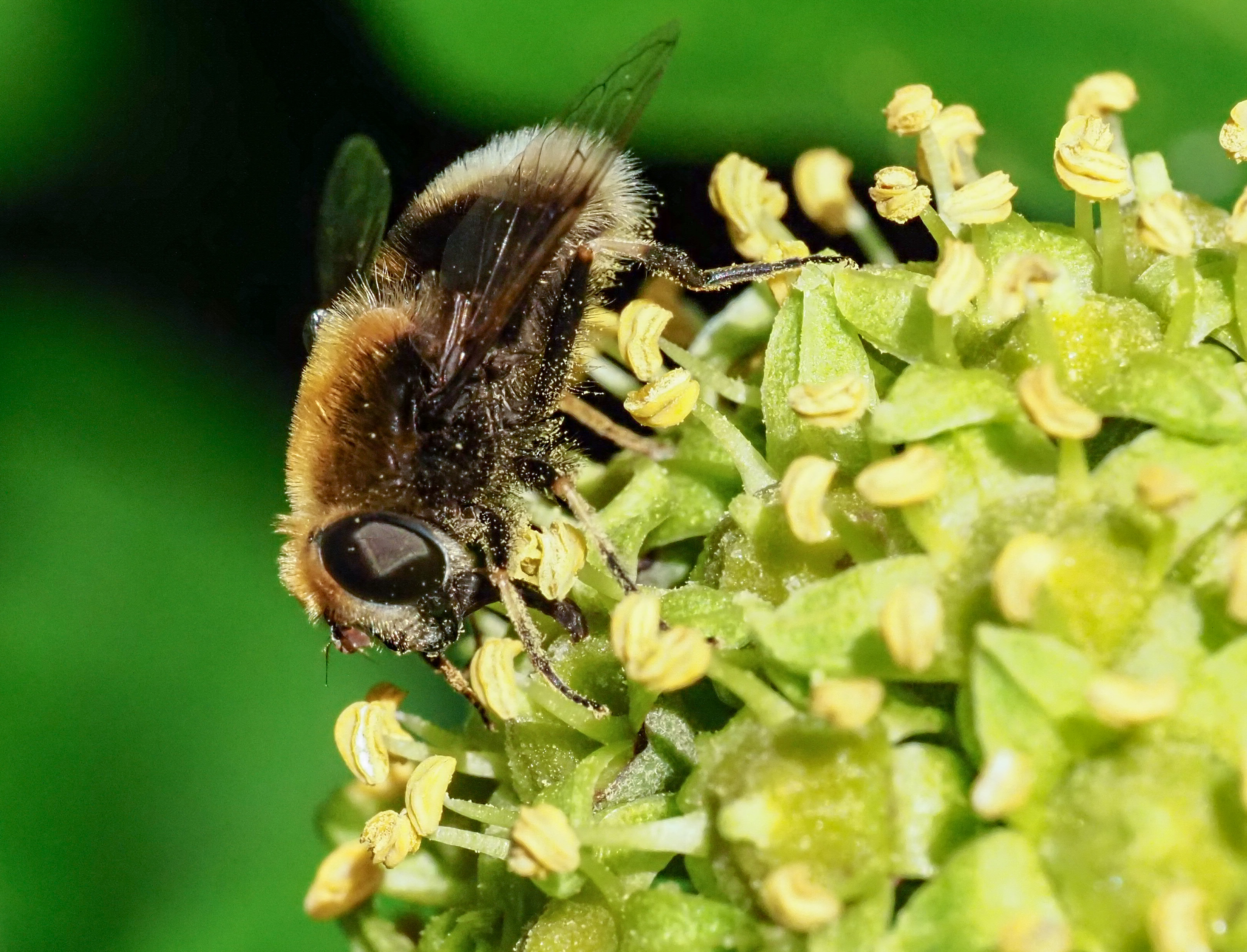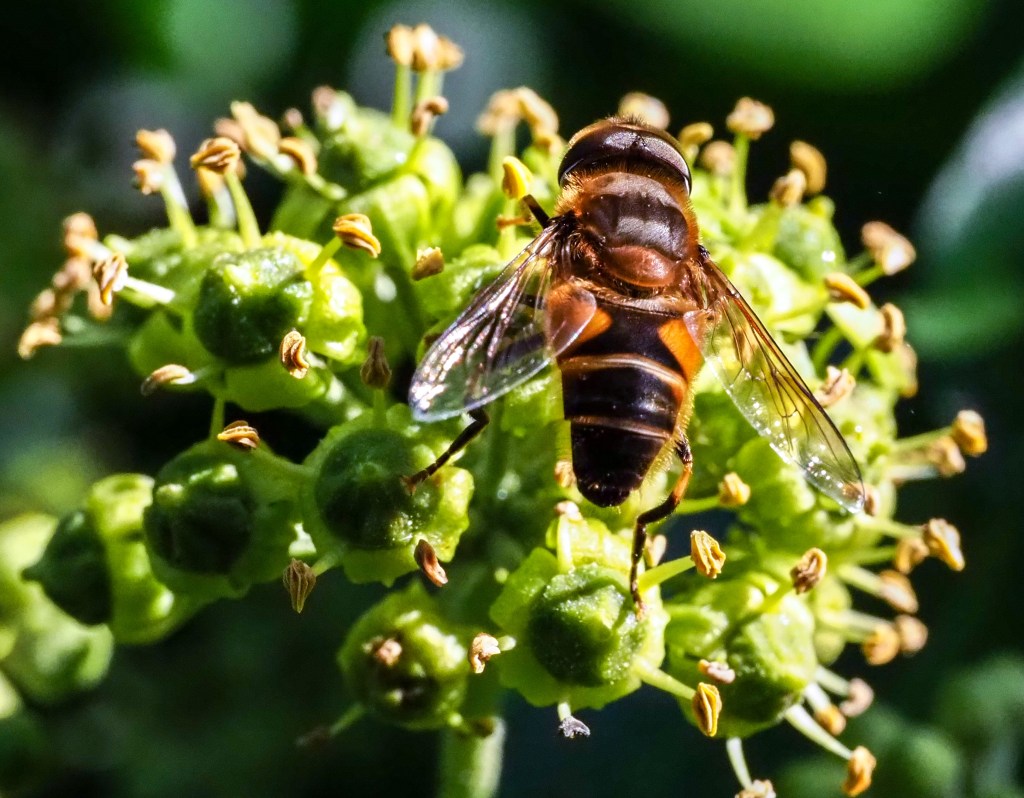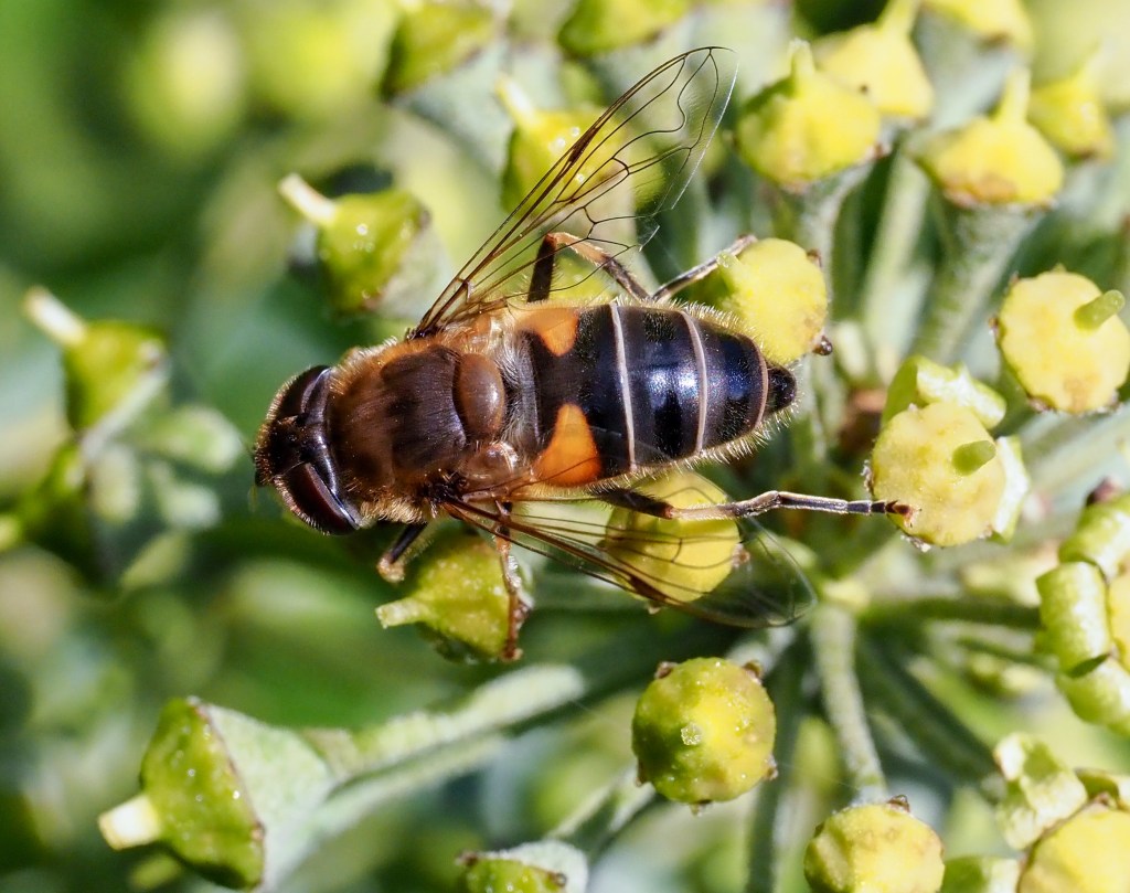 Eristalis spp. hoverflies are probably one of the commonest flies to be found nectaring on ivy. The different species can be a little bit tricky to tell apart, depending on what parts of the insect are captured in a given photograph. I.e. can you see whether the hind legs are dark and curved (E. tenax); or whether the front and mid legs (mid-tarsi) are pale yellow (E. pertinax); is the face dusted yellow (E. arbustorum); and so on. Fortunately, we have such good insect guide books now.
