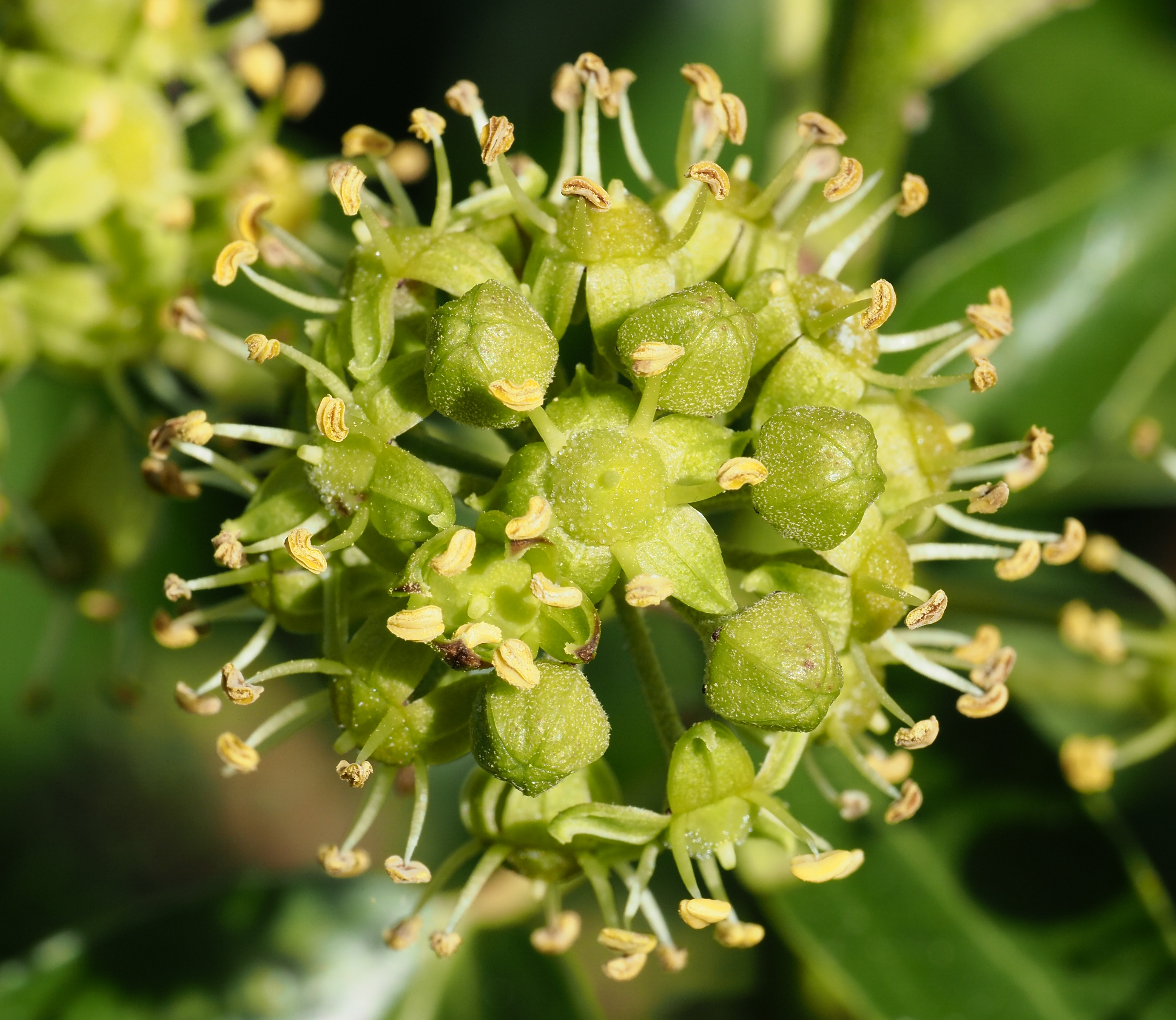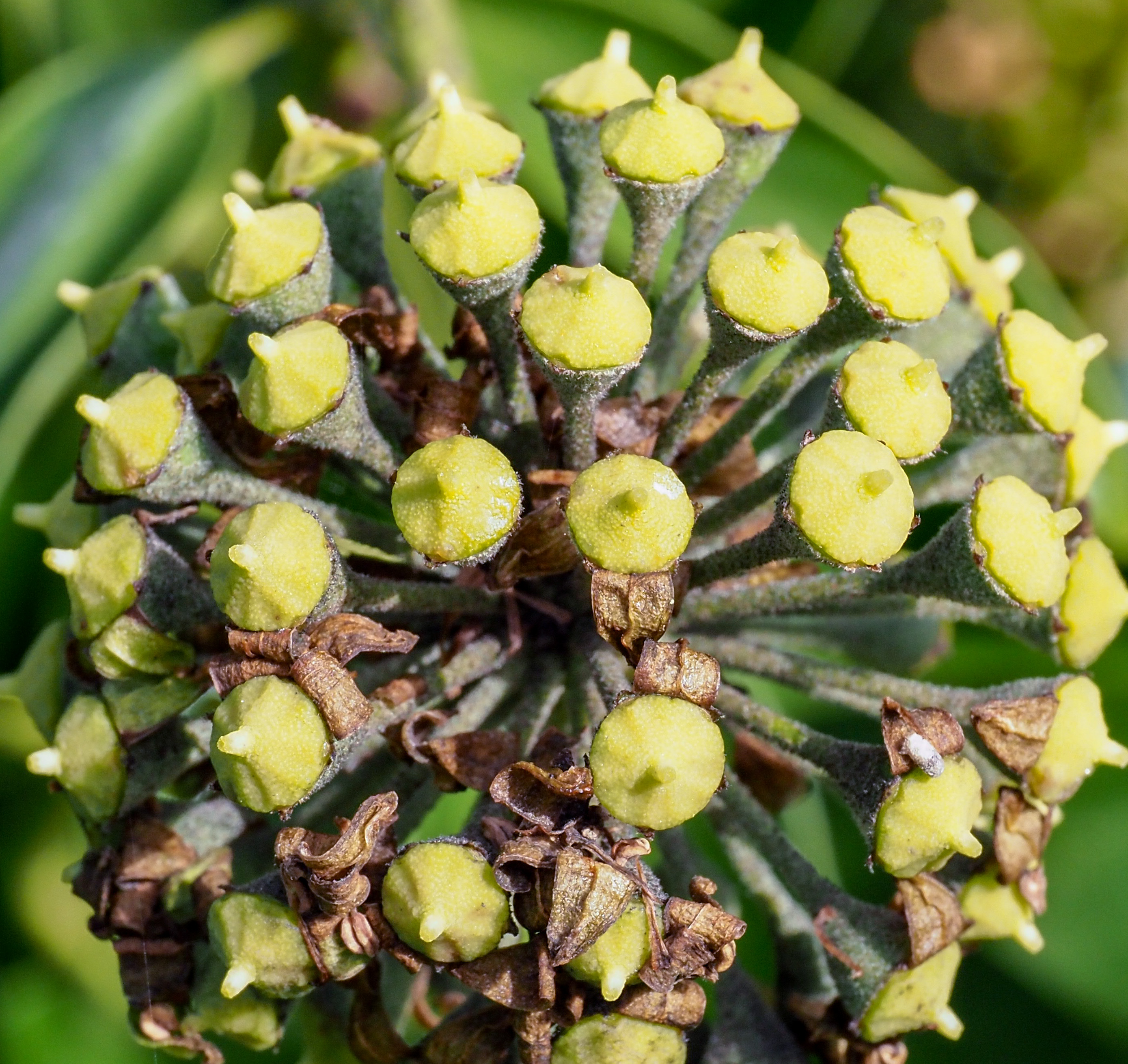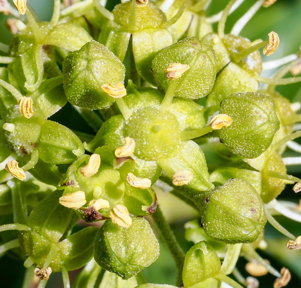 The flowers get fertilised and gradually turn into dark fruits the following spring. The anthers turn brown and fall off; the petals also turn brown and the cups swell into fruits. At some point the umbel head stops producing nectar.