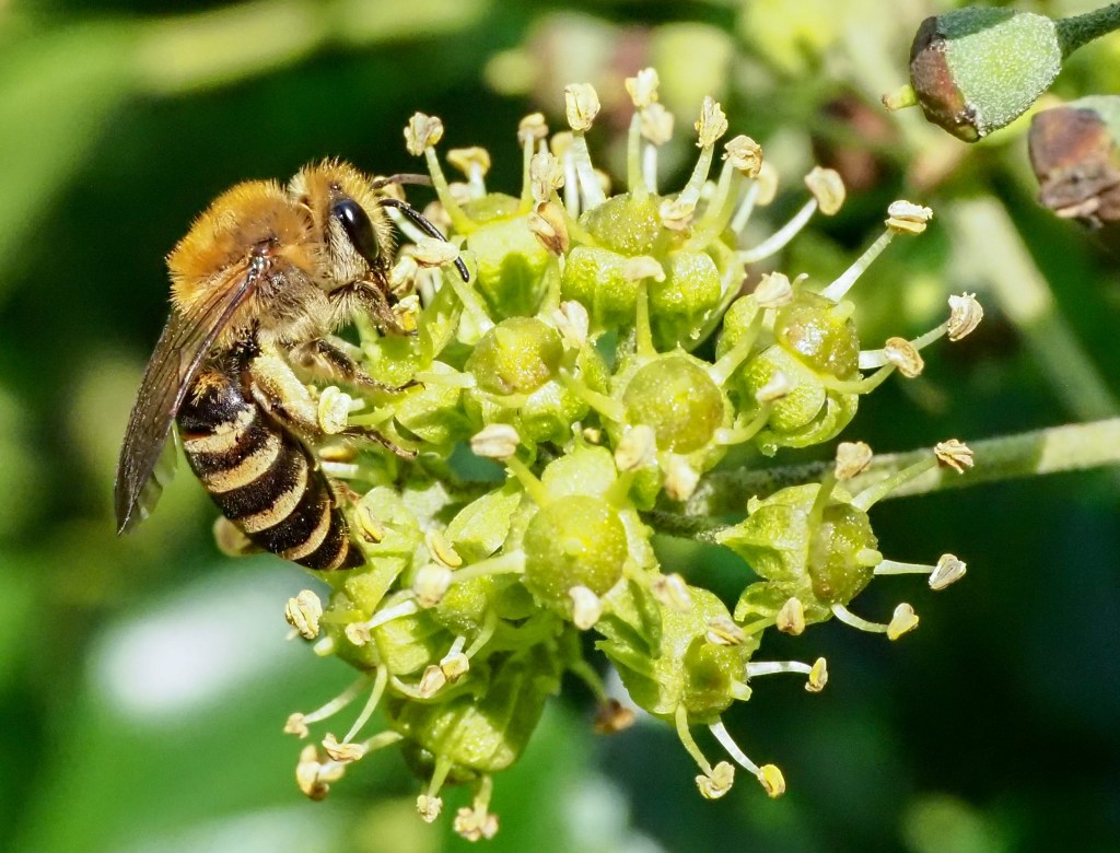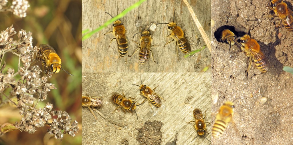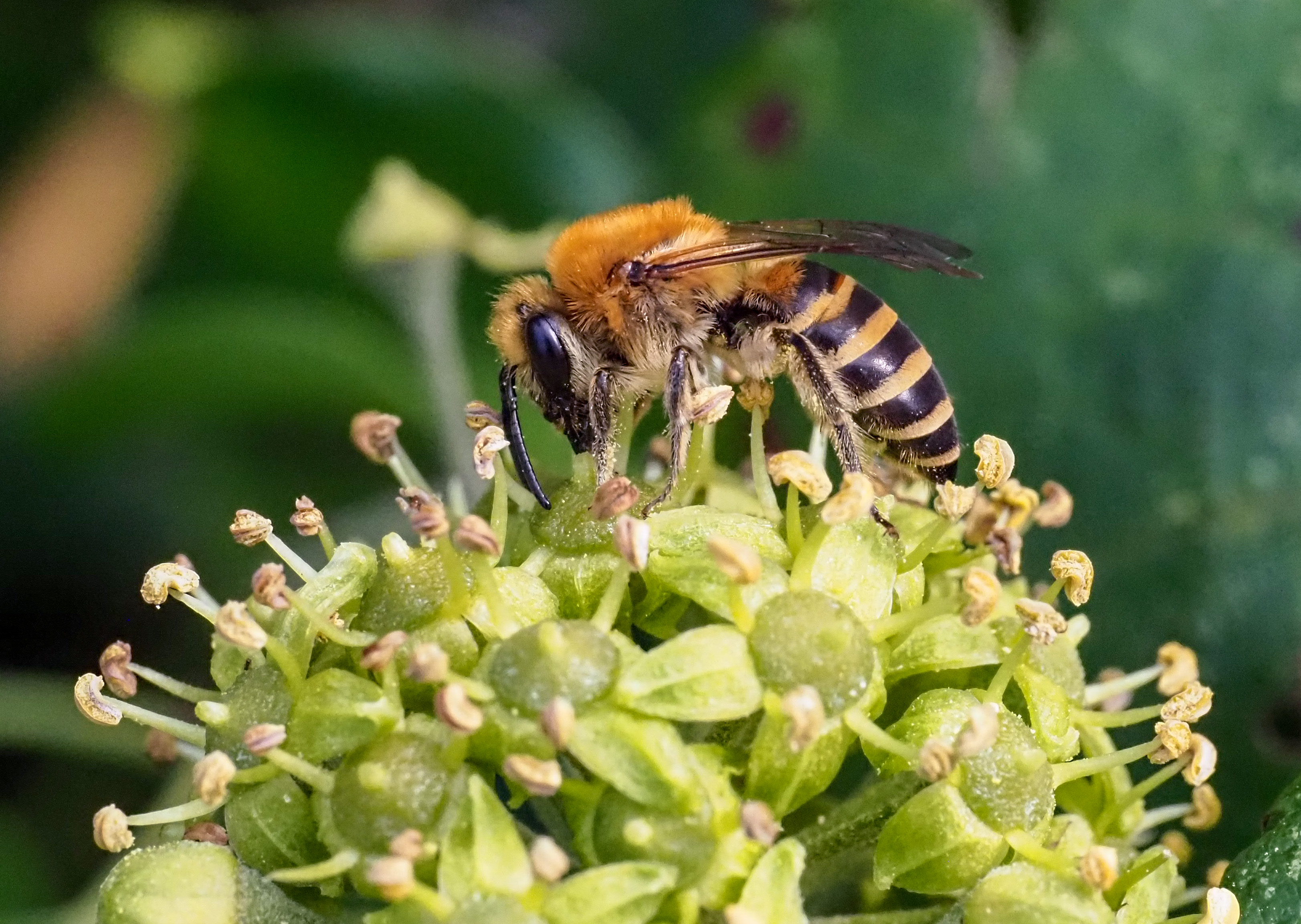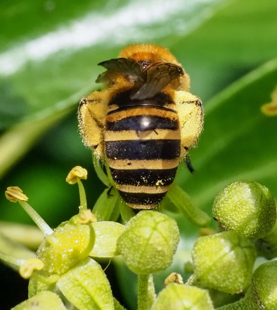 Ivy bees (Colletes hederae) are pretty little solitary bees which appear late in the year and forage on ivy (Hedera spp.). There are often dozens of these stripy little mining bees – so called because they nest in the ground, in loose, sandy soil – buzzing around the ivy flowers in September and October. They have furry ginger thoraxes and orange/yellow and black striped abdomens (below).