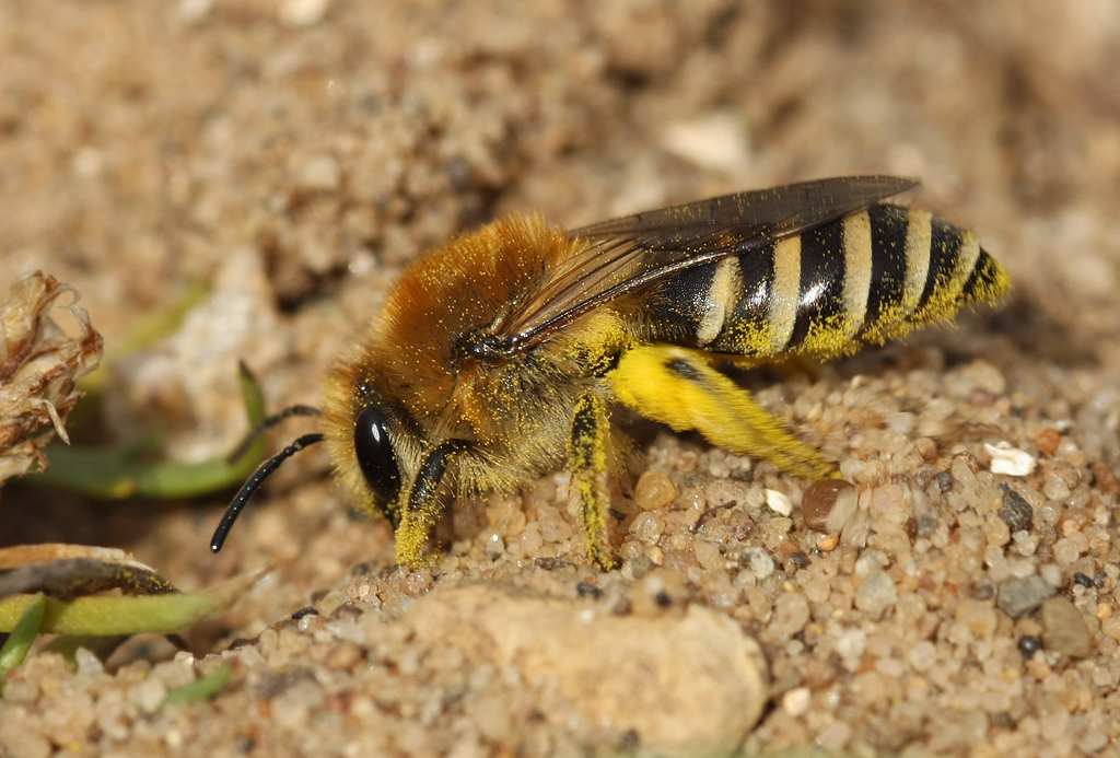 The other two, similar looking species are Colletes succinctus, which gathers Heather pollen and and C. halophilus which gathers Sea Aster pollen (shown below).