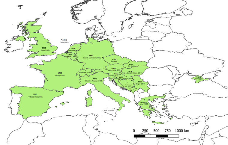 Distribution range map of Colletes hederae (green background) with the year of the first record/specimen (in the case of publishing) and references for each country (Feitz 2001Gogala 1991Gogala 1994Lefeber 1998Petit 1996).