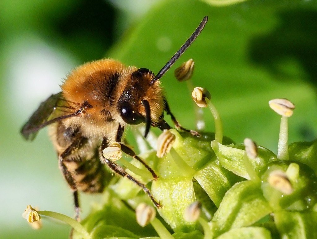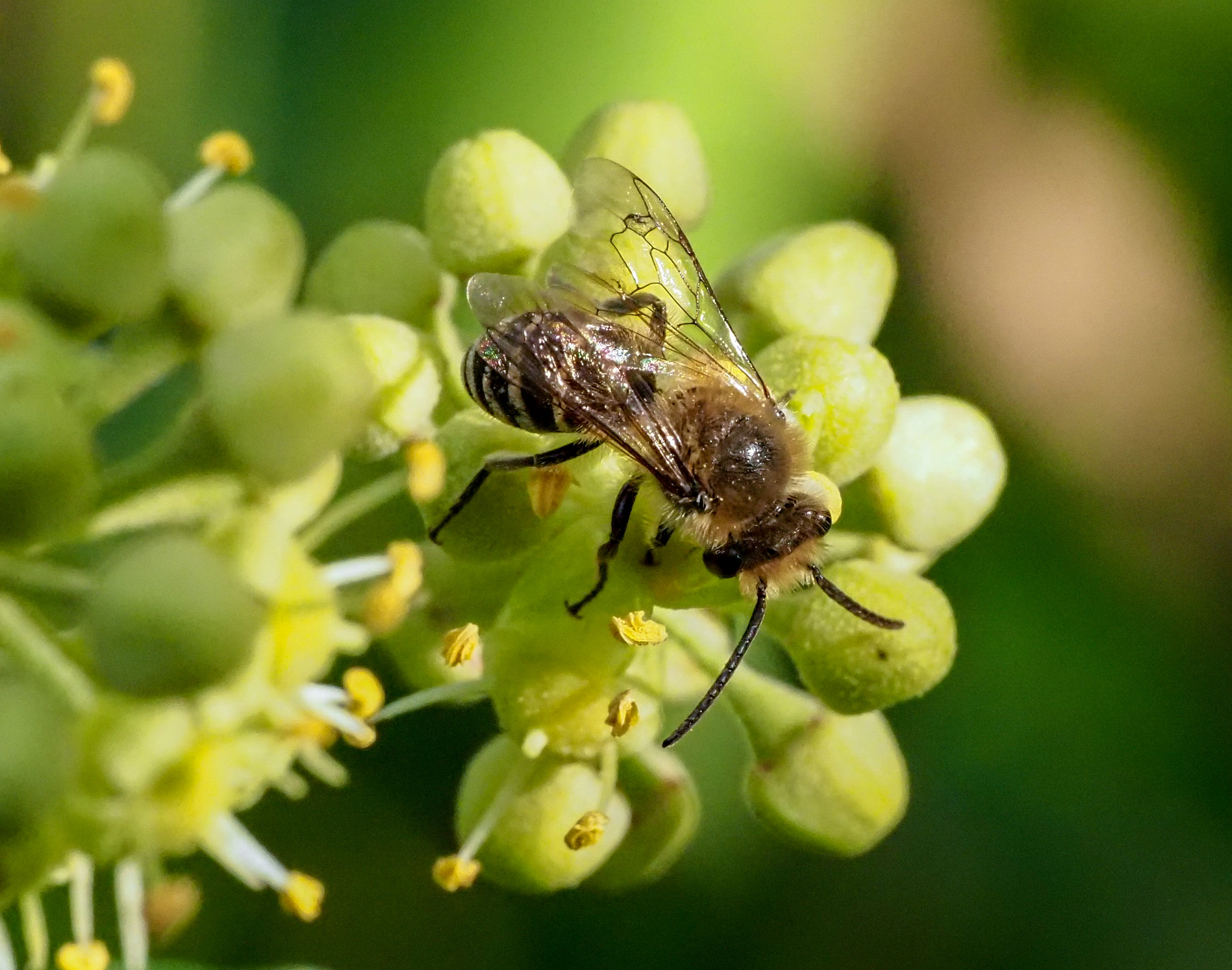 The smaller males (see below) emerge before the females and may forage on a variety of species before ivy comes into bloom.