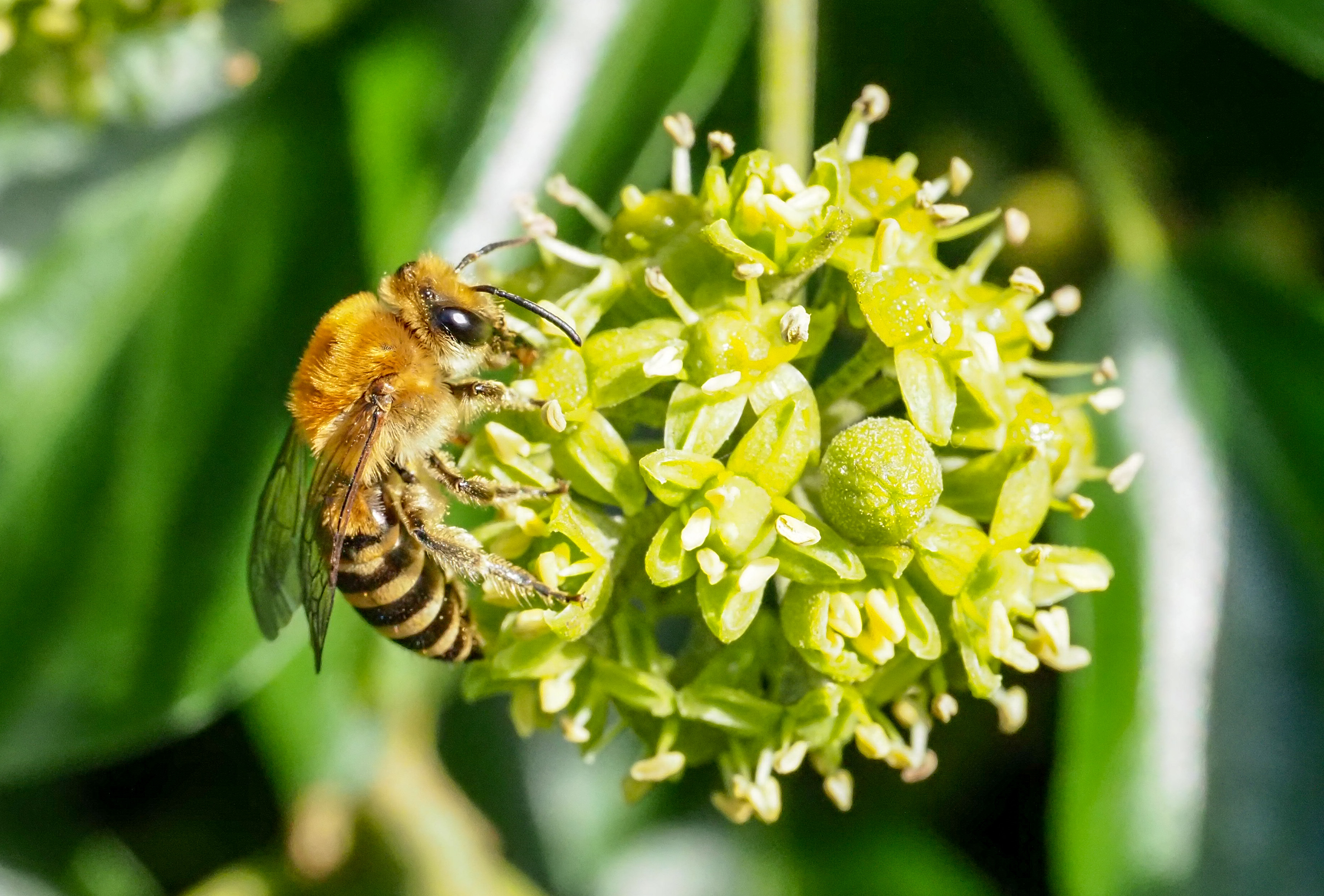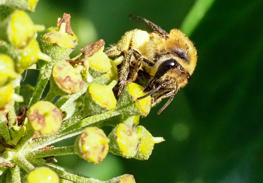 Ivy bees are attracted by the different floral scents emitted by H. helix – they are quite a pungent flower when in bloom – but they also respond to visual cues, despite ivy flowers being relatively inconspicuous, visually, against the bright green leaves (see photo below).