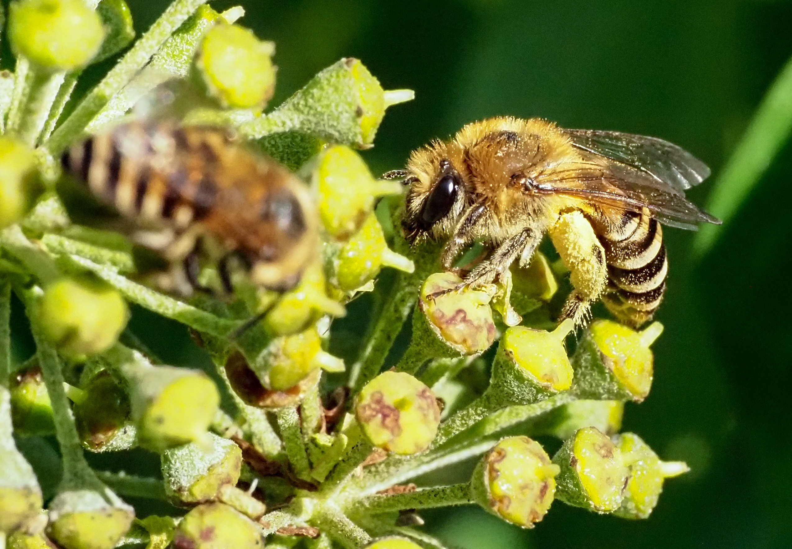It is fairly easy to identify Ivy Bees on ivy, and to distinguish them from honeybees, even though they are a similar size and both nectar on Ivy flowers in the late summer and autumn. Here are photographs of the two species I took on the same day (below).