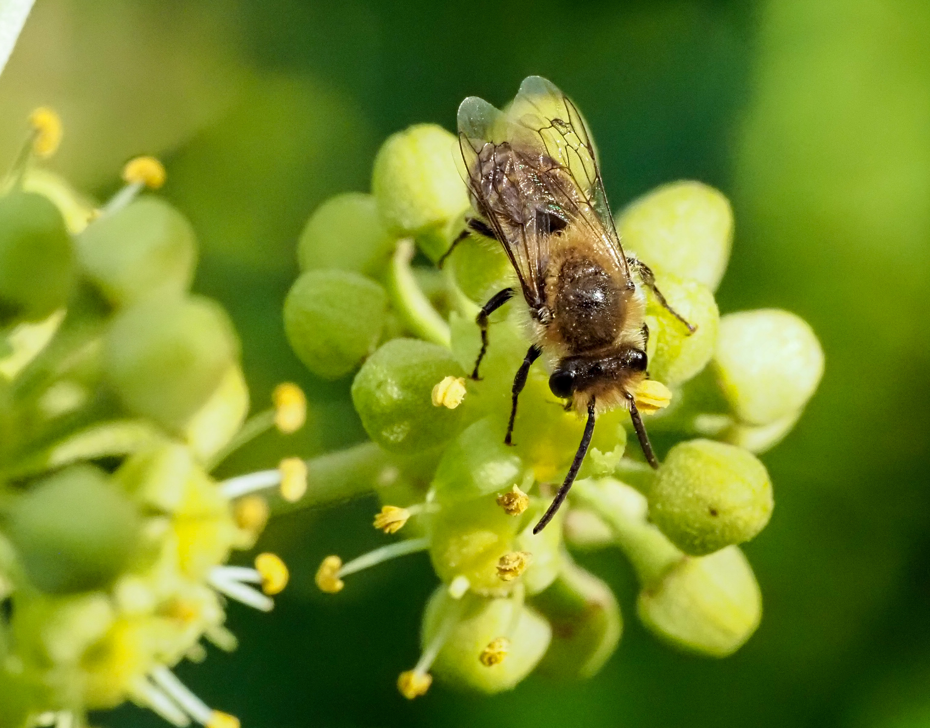 Ivy bees appear to transport dry pollen in less dense scopae on their hind-legs (see below), which means that the pollen grains remain viable for cross-pollination. N.B. bumblebees and honeybees often mix pollen with nectar and transport it as a dense, moist clump, which reduces the viability of the pollen (Parker et al., 2015).