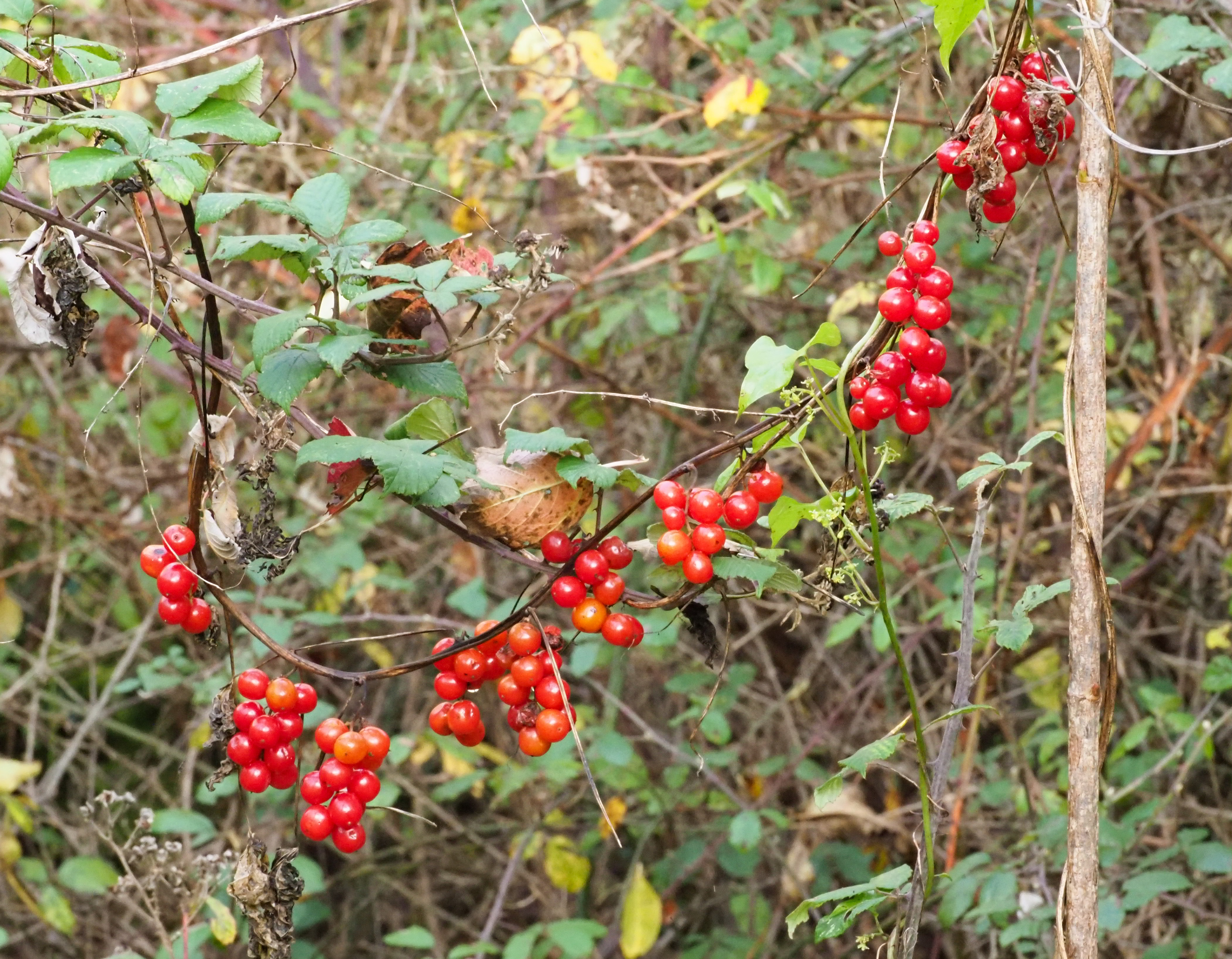 Some red berries are poisonous of course! Most are at least distasteful for humans, but the shiny red berries of Black bryony (Dioscorea communis) are poisonous! As well as containing calcium oxalate crystals, which can cause severe irritation, they are also chock-a-block with toxic compounds like, 7-Hydroxy-2,3,4,8-tetramethoxyphenanthrene, and a host of other phenanthrenes! These compounds probably evolved for a variety of reasons – e.g. protection of the seeds in the soil – and some newly isolated phenanthrene compounds have been discovered to have cytotoxic, antimicrobial, anti-inflammatory, and antioxidant effects! Plants have some magic chemicals up their sleeves! Looking like a discarded necklace, they may turn out to contain a new anticancer agent!
