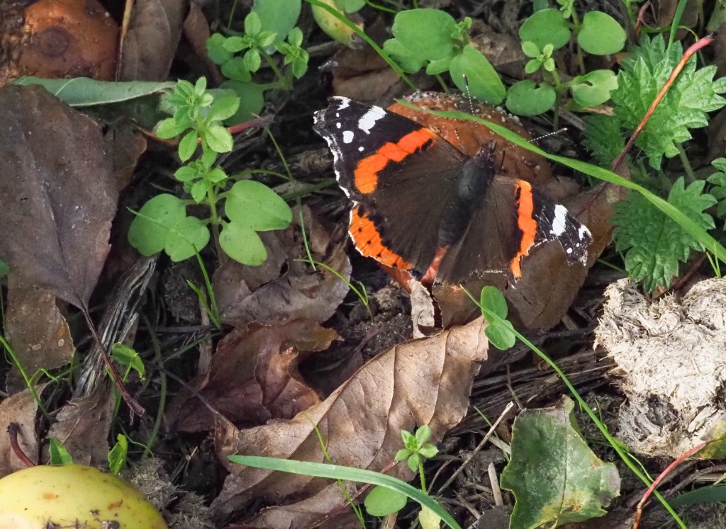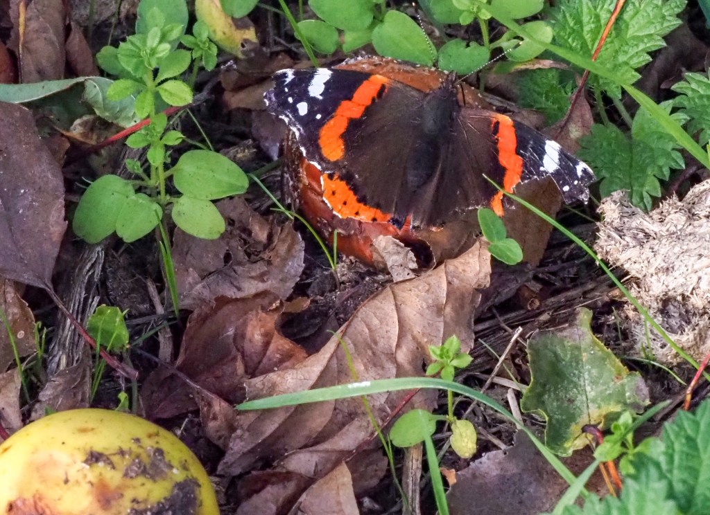 As I passed a crab apple tree, I stopped to see whether there were any butterflies, and lo and behold (!), there was a rather worn Red Admiral nectaring on the fallen apples. These butterflies have taste sensors – contact-chemoreceptor (gustatory) sensillae – on their feet (tarsi), as well as their proboscis (feeding tube) to assess the composition of the fluids in the fruit and to decide whether to eat it! This butterfly might well overwinter under a pile of logs somewhere, and despite having lost some chunks of its right wing, could well survive and emerge to breed in the Spring next year.