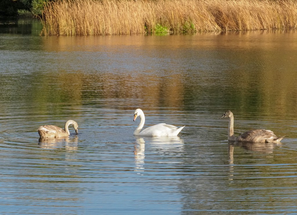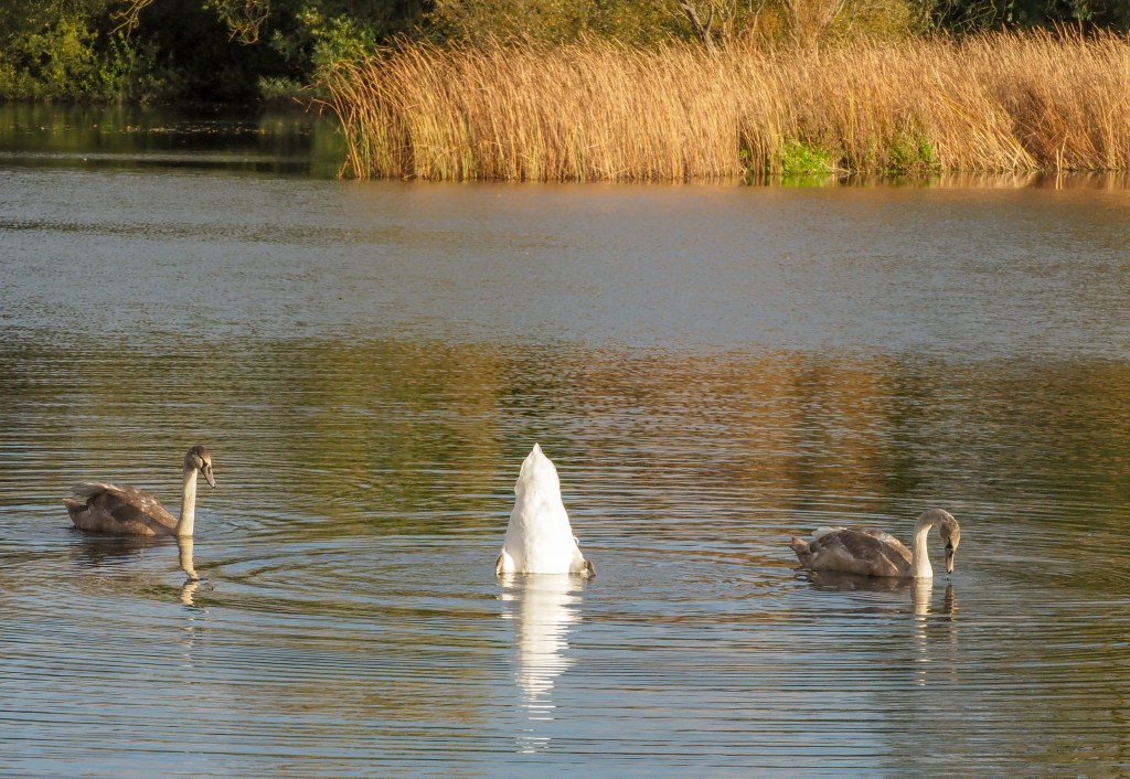 Walking along the edge of the lake at Felmersham Gravel Pits, I watched the swan family which has been there all summer; sometimes feeding on the green algae in the small back ponds, at other times bending down, tails in the air, to feed on water plants in the main lake.