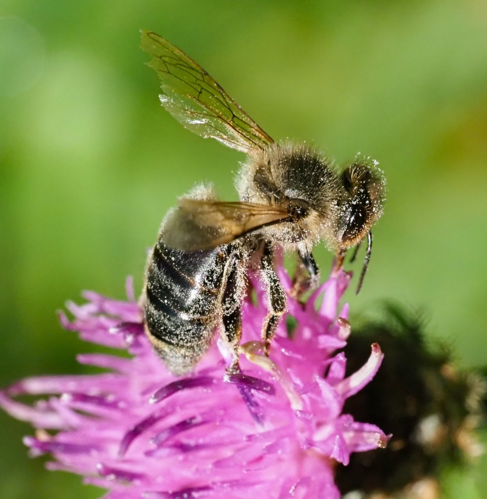 Most bees groom the top of their thorax – which is often covered in pollen grains (see below) – by scraping it in a forward direction, using the middle legs. There are however, a few exceptions: some cuckoo bees in the genus Triepeoliis (Apidae), use a hind-leg instead, and digger bees in the subfamily Anthophorinae, use their fore-legs (Jander, 1976).