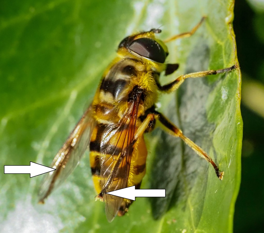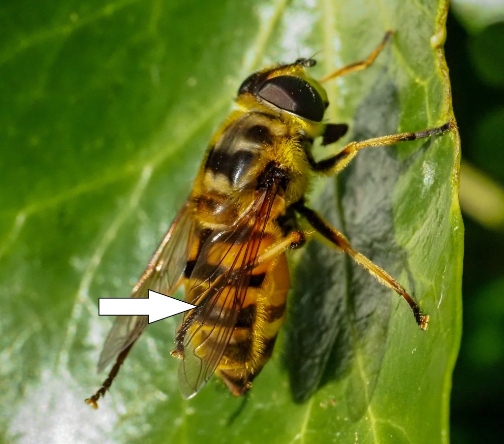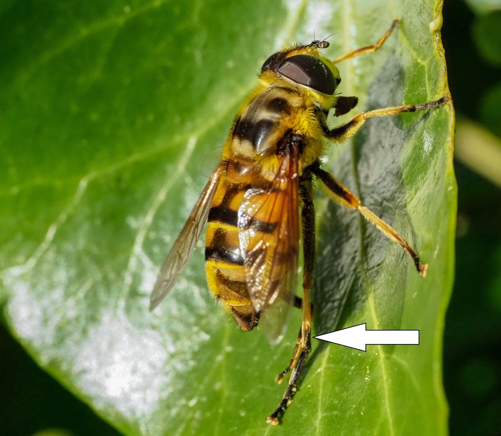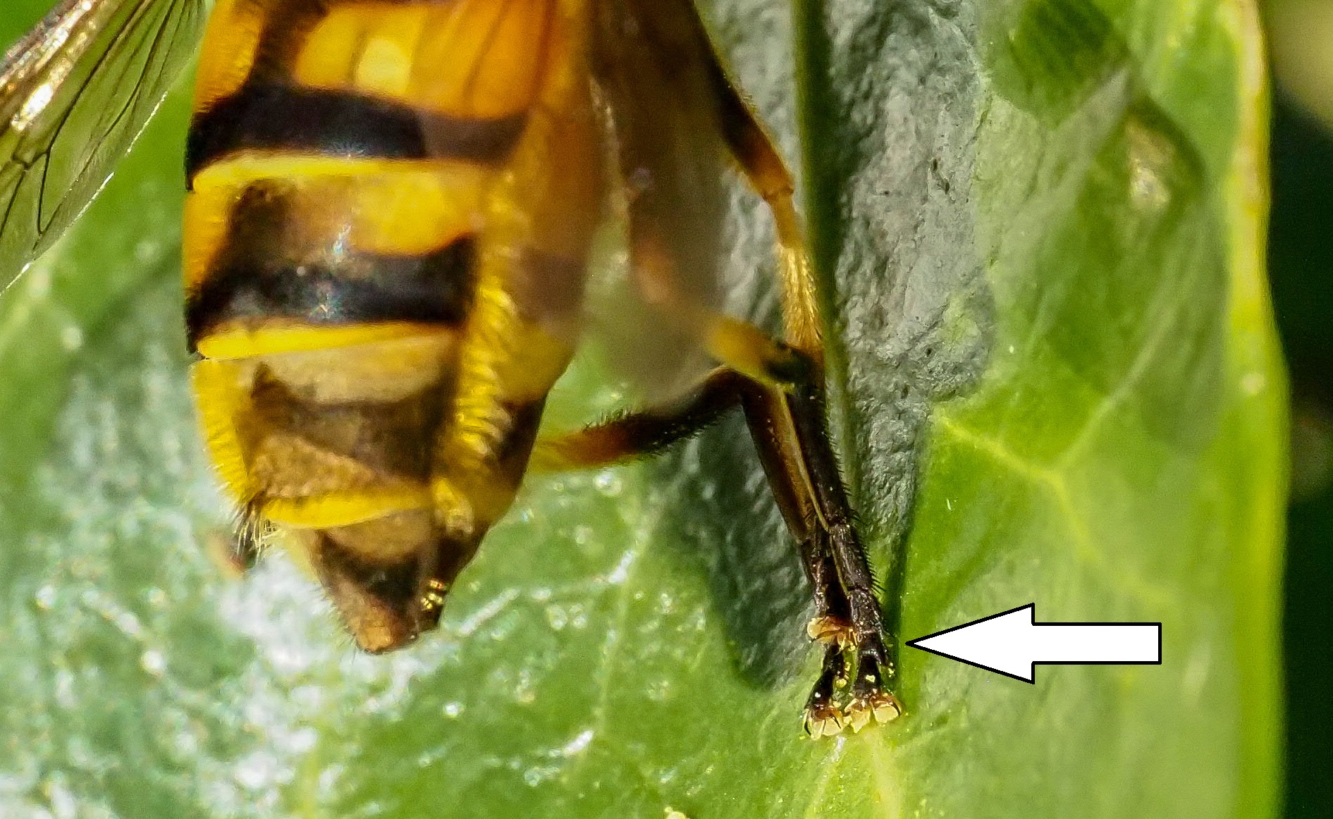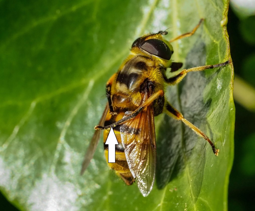 Finally, the hoverfly cleans its hind-legs, although this sequence (shown below) starts with its leg bent back over the top of the abdomen. At one point, both hind-tarsi and held neatly together, on the right-hand side, indicated by the arrow (below, top right).