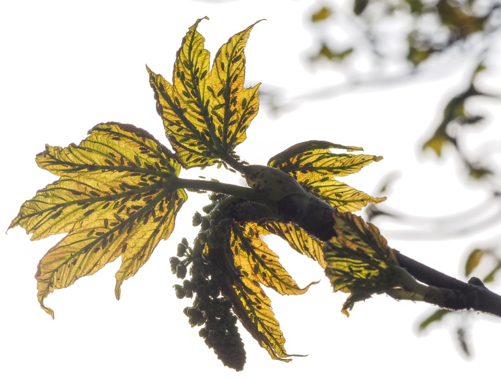 Sycamore tree (Acer pseudoplatanus) with flowers on 30 April. Spot the aphids! Photo by Raymond JC Cannon