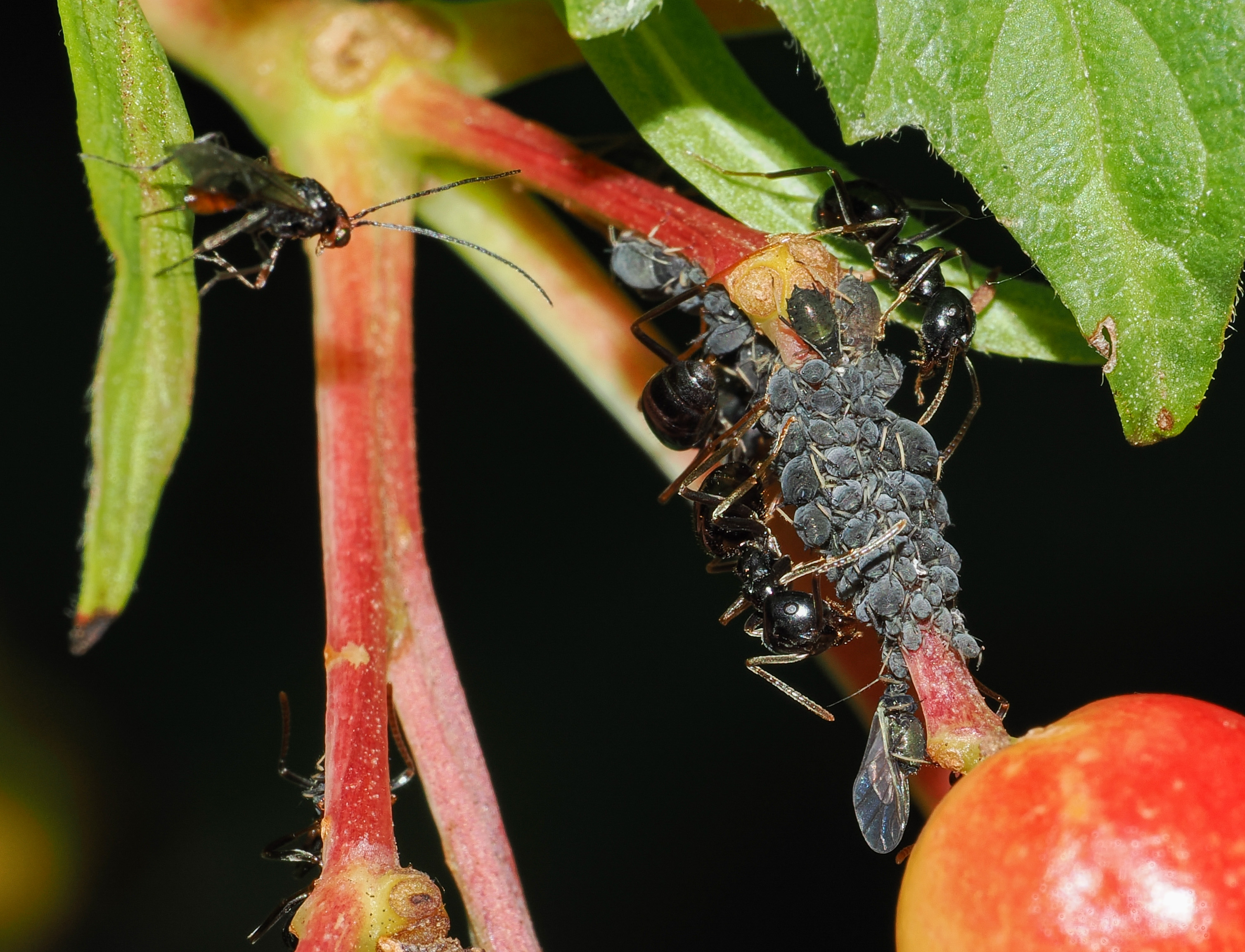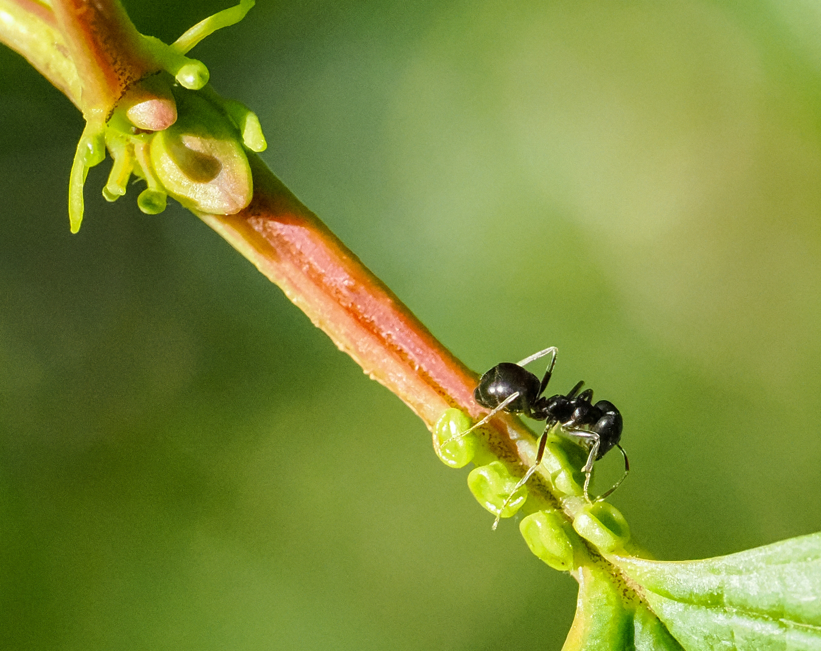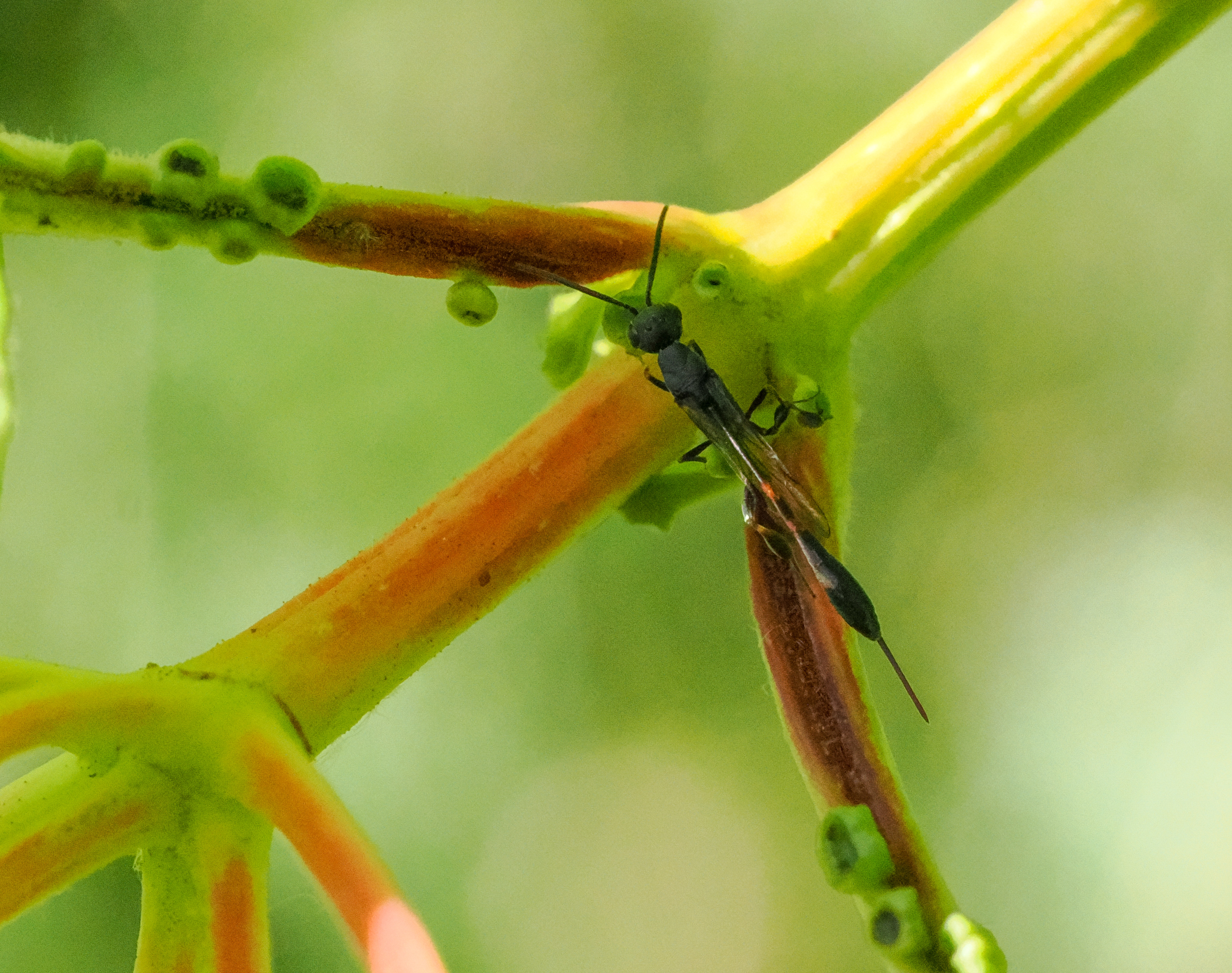 (ii) EFNs are a food source, which could lead to the establishment of ant nests closer to plants and thereby, improve the plant nutrition. However, ants also ‘farm’ aphids – as a source of phloem sap – and this often occurs on plants with EFNs. I photographed black ants tending ants colony of aphids – viburnum aphids (Aphis viburni), I think – on a guelder rose plant (see below). Notice the parasitoid wasp – with sharp ovipositor – on the top left of the first picture. No doubt waiting to parasitise the aphids!