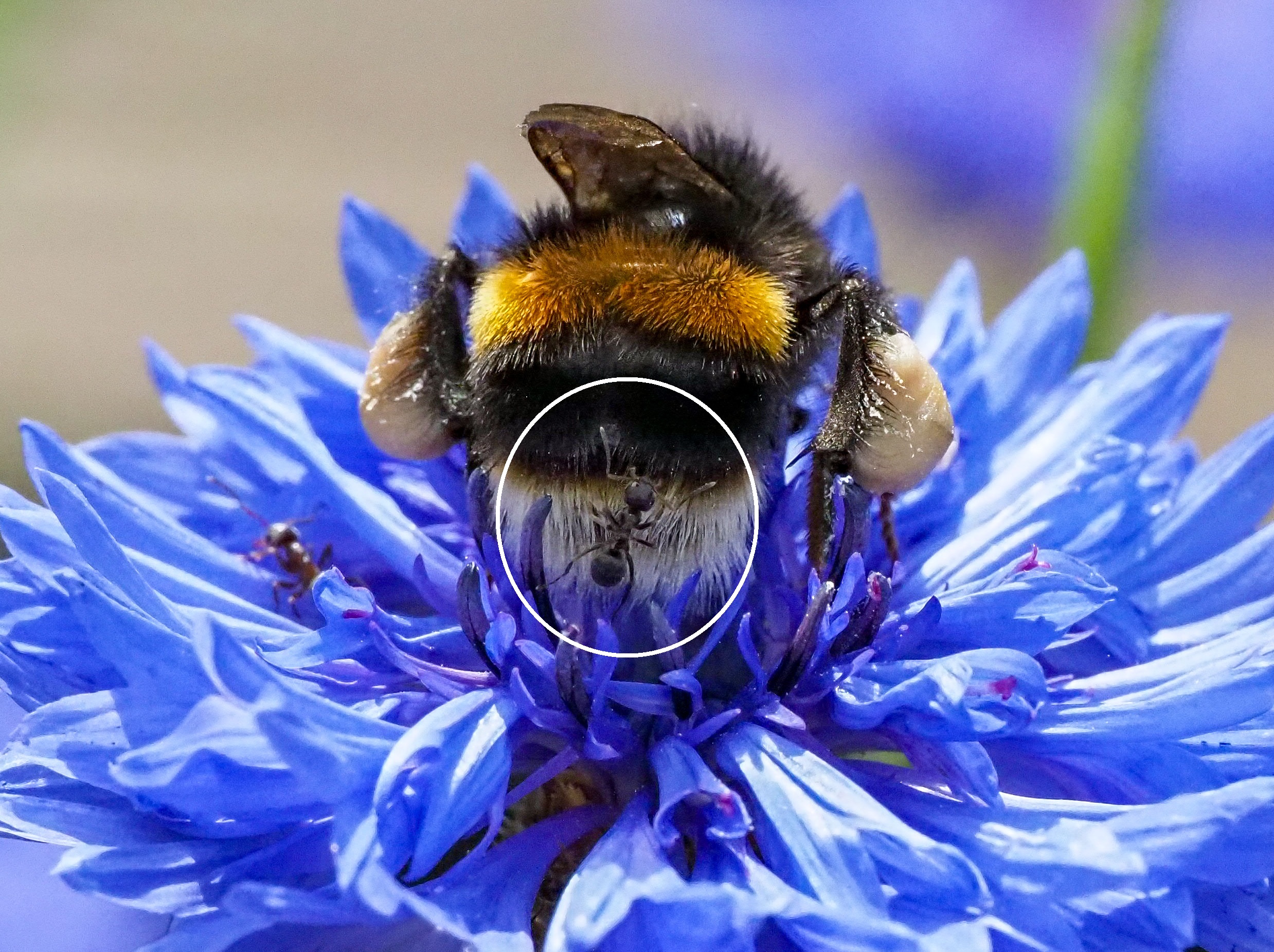 The buff-tailed bumblebee (Bombus terrestris), which I photographed on a cornflower (below), dwarfs the two tiny bees, also foraging – presumably – on the same flower. In this case, there does not appear to be any ‘ant-pollinator’ conflict; the bumblebee is just too big!