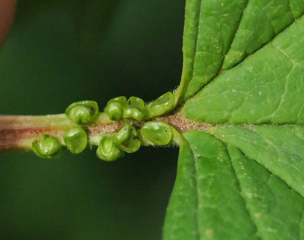 As well as the nectar-rich flowers, guelder rose plants have extra-floral nectaries (EFNs) at the base of each leaf-blade. These glands are variable in size (0.5–1 mm), and on some leaves there may be up to five pairs which extend onto the edge of the leaf lamina (shown below).