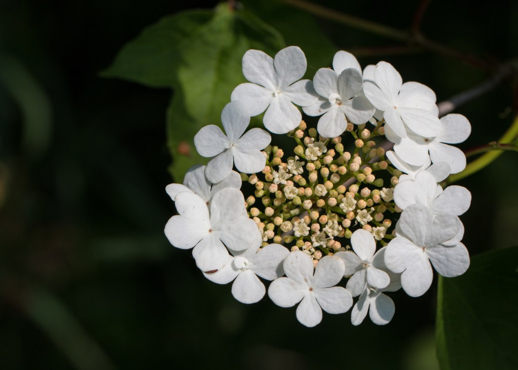 Earlier in the year it is covered in clusters of white flowers, composed of tubular white fertile flowers surrounded by larger white sterile flowers (below).