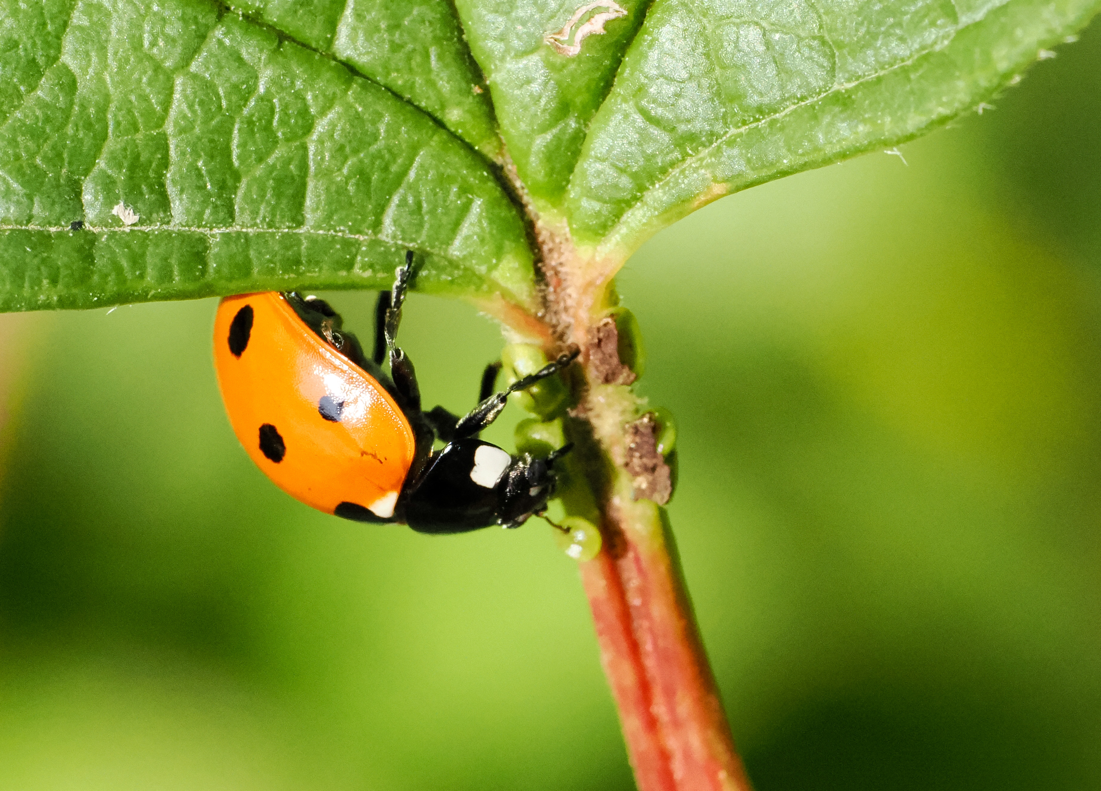 Photographing insects visiting extra-floral nectaries on guelder rose plants led me to thinking about the wider implications of these structures in the woodland where this species is relatively common. For example, rewarding ladybirds with EF nectar may result in better control of homopterans, such as aphids, which presumably take a toll on the plant’s phloem supply. Visiting parasitoids (see photo) are likewise rewarded with a drink while waiting to deposit their eggs in the hapless aphids.