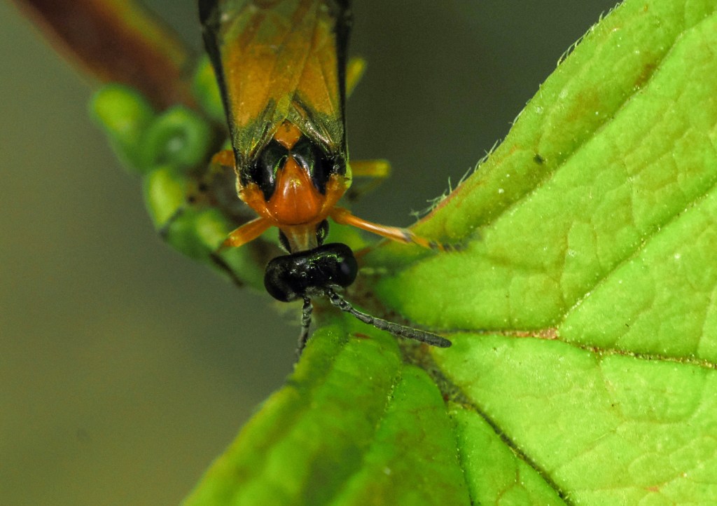 In conclusion, the function of the EFNs is far more general than perhaps realised. A specific mutualism turns out to be a wide, multispecies interaction, which benefits the plant in multifarious ways. EFNs are at the heart of an even wider network within the woodland ecosystem, as the bees, wasps, flies and beetles are all interacting with other arthropods and other plants in vicinity. Sawflies, like the turnip sawfly (Athalia rosae) seen below feeding on Guelder rose, seem particularly fond of the extra-floral nectar!