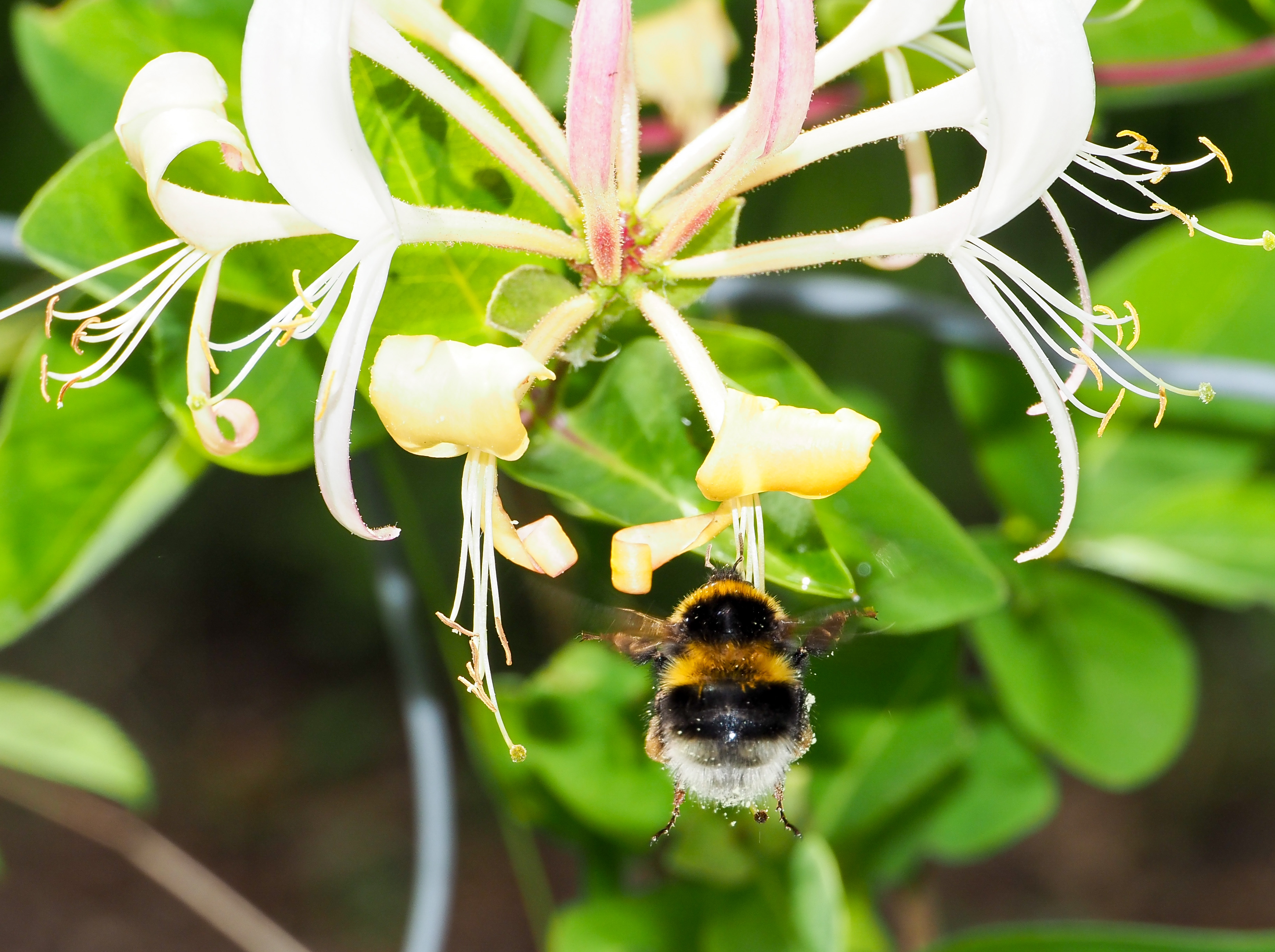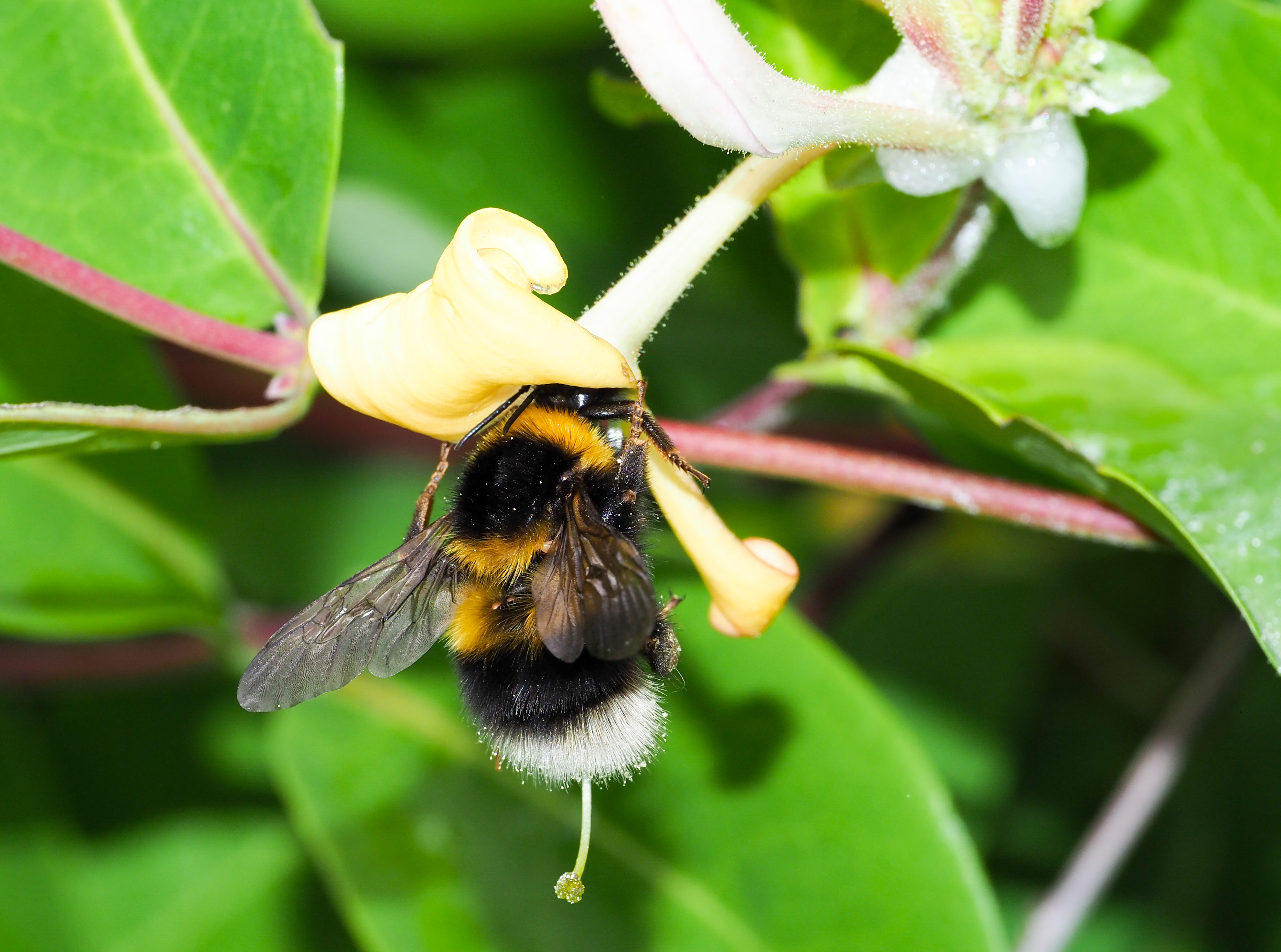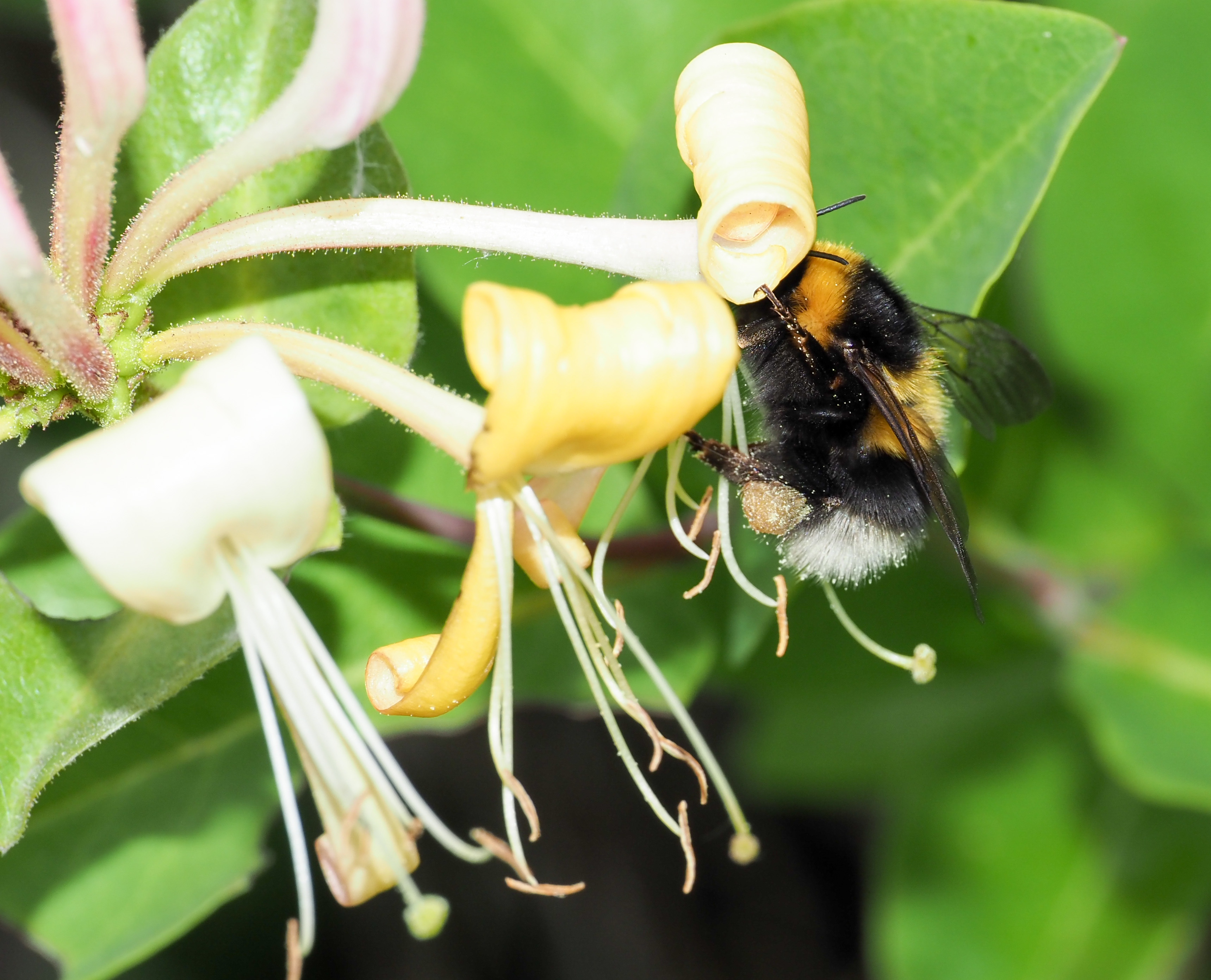 Bumblebees with long tongues prefer flowers with longer calyx tubes, and these deeper tubed flowers often produce more nectar than short-tubed ones. A good example of such a flower is common honeysuckle, Lonicera periclymenum. Not surprisingly, garden bumblebees, Bombus hortorum, are frequent visitors. Hoverflies and honeybees also visit honeysuckle flowers, but they are after pollen rather than nectar, which is readily accessible on the long, protruding stamens.