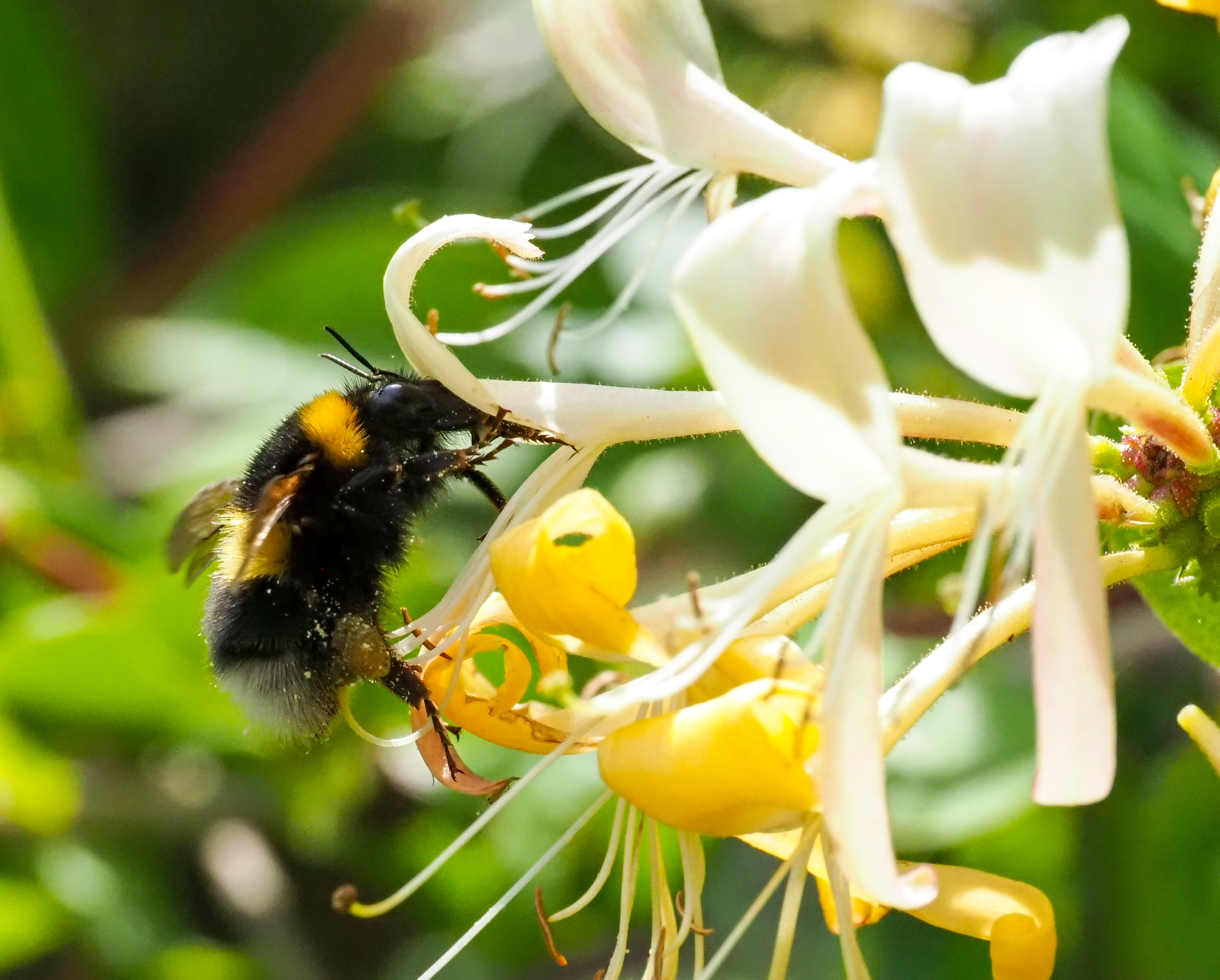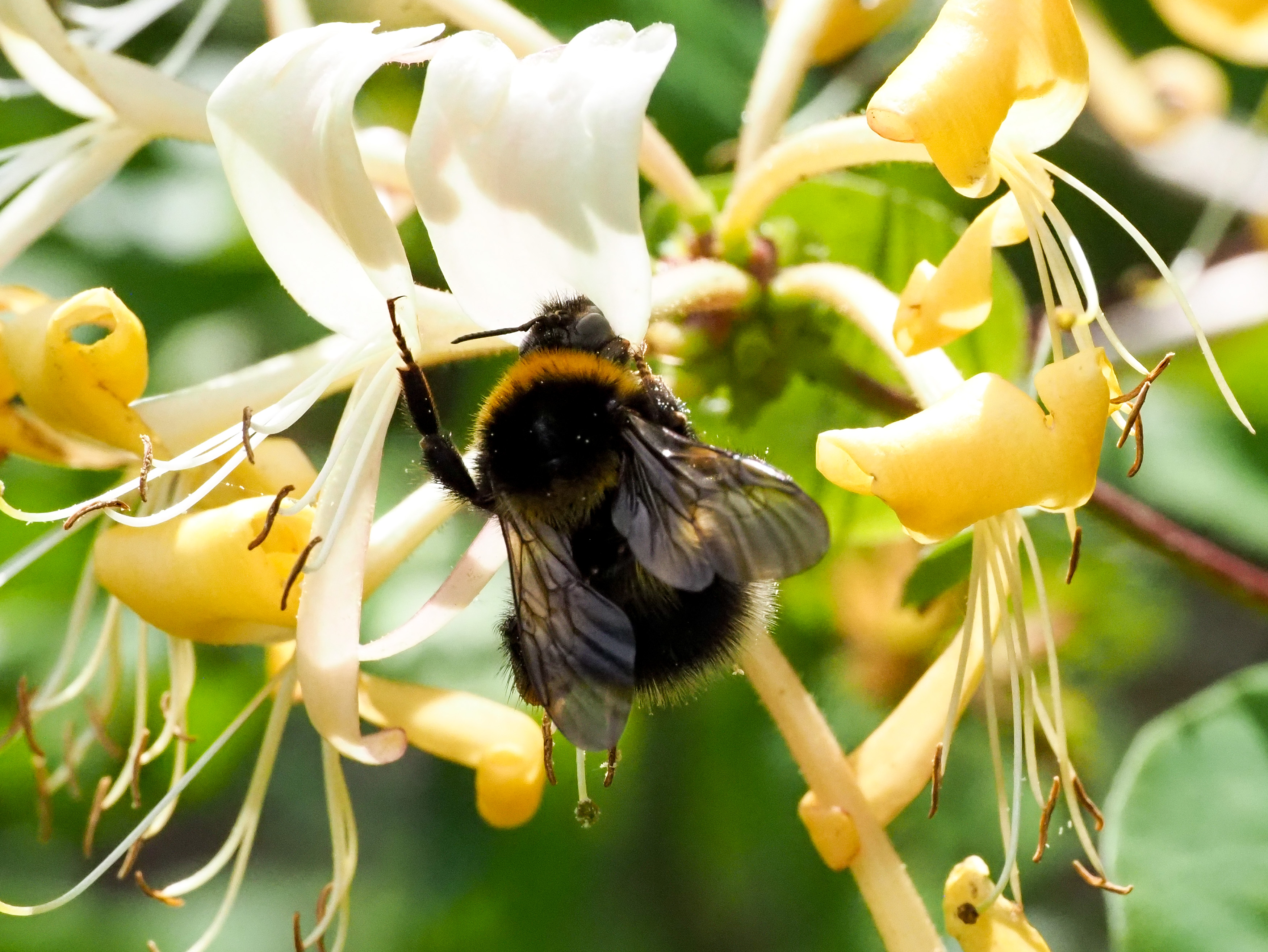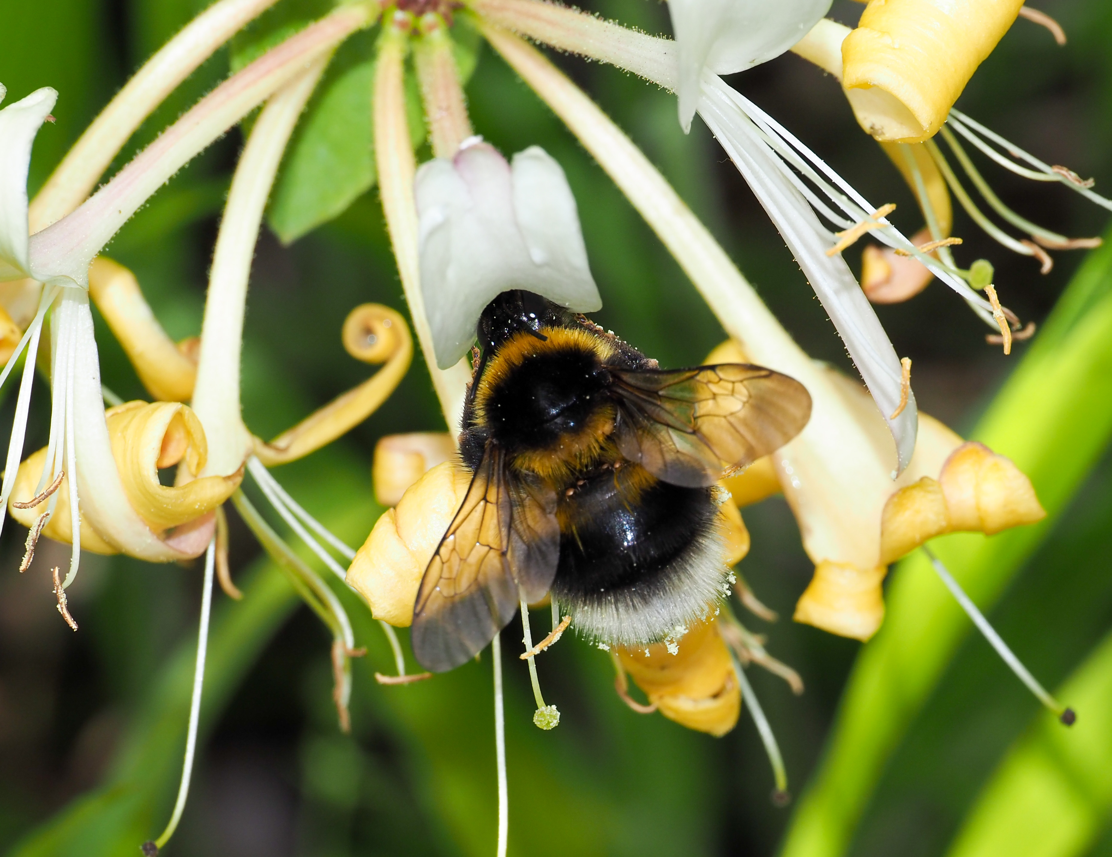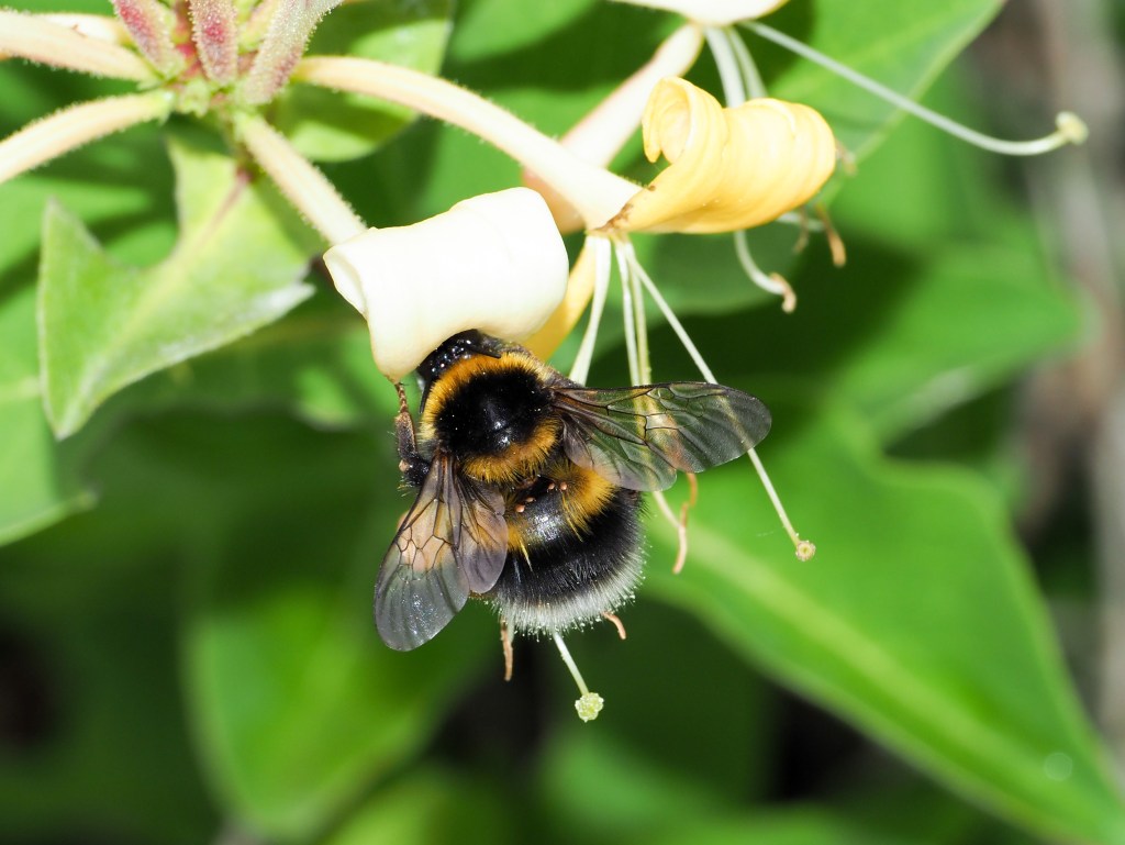 Bumblebees with long tongues prefer flowers with longer calyx tubes, and these deeper tubed flowers often produce more nectar than short-tubed ones. A good example of such a flower is common honeysuckle, Lonicera periclymenum. Not surprisingly, garden bumblebees, Bombus hortorum, are frequent visitors. Hoverflies and honeybees also visit honeysuckle flowers, but they are after pollen rather than nectar, which is readily accessible on the long, protruding stamens.