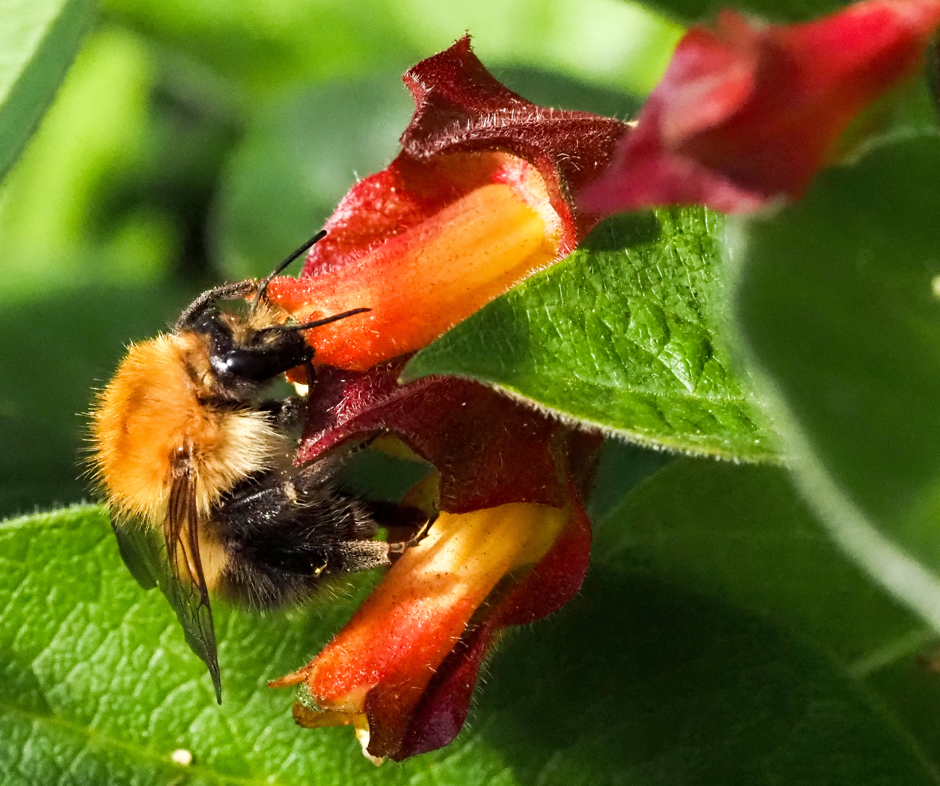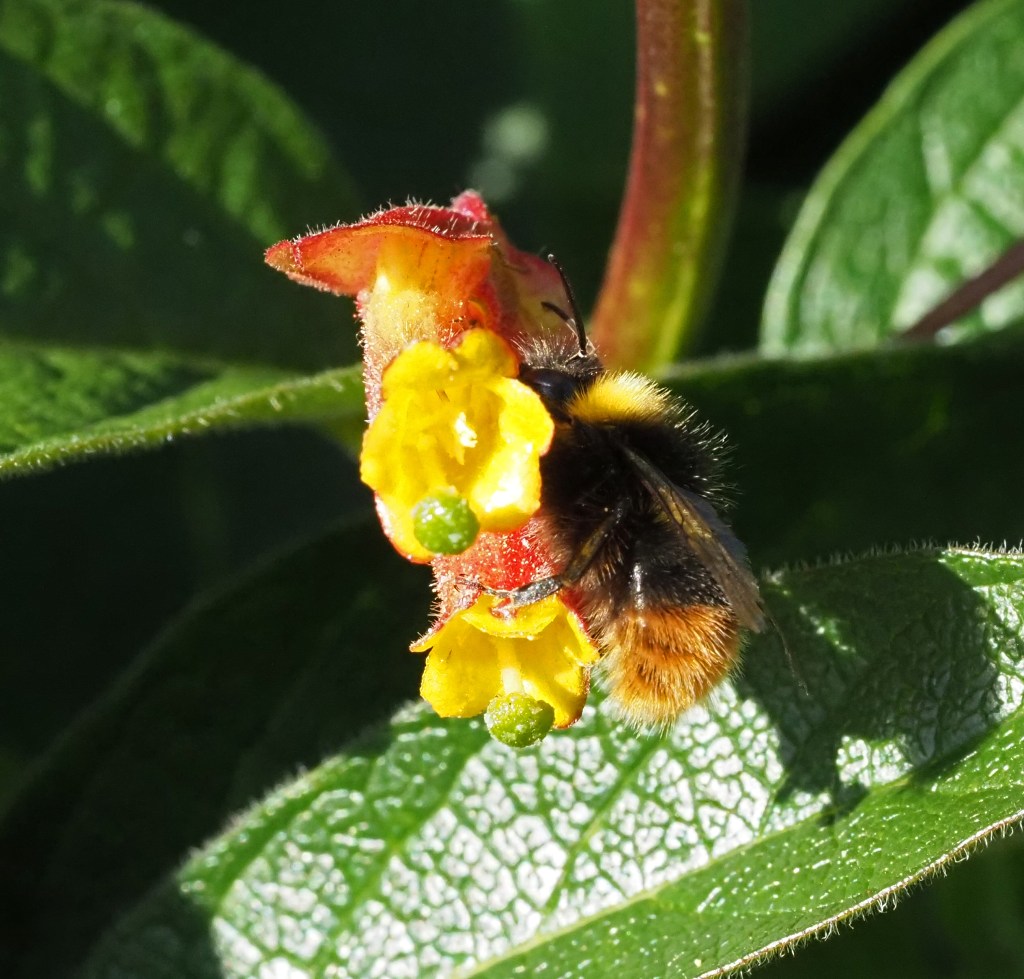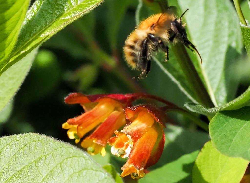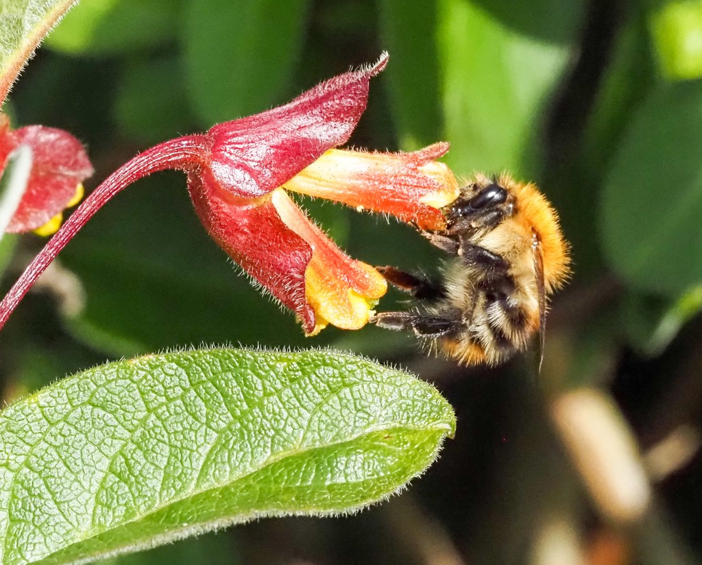 Twinberry honeysuckle, or Californian Honeysuckle (Lonicera involucrata) is a non-native, hardy shrub from North America. It is widely available in UK nurseries and garden centres and is not considered an invasive species of any concern. Native UK bumblebees seem to like it, and I regularly photograph them feeding on the flowers in June.