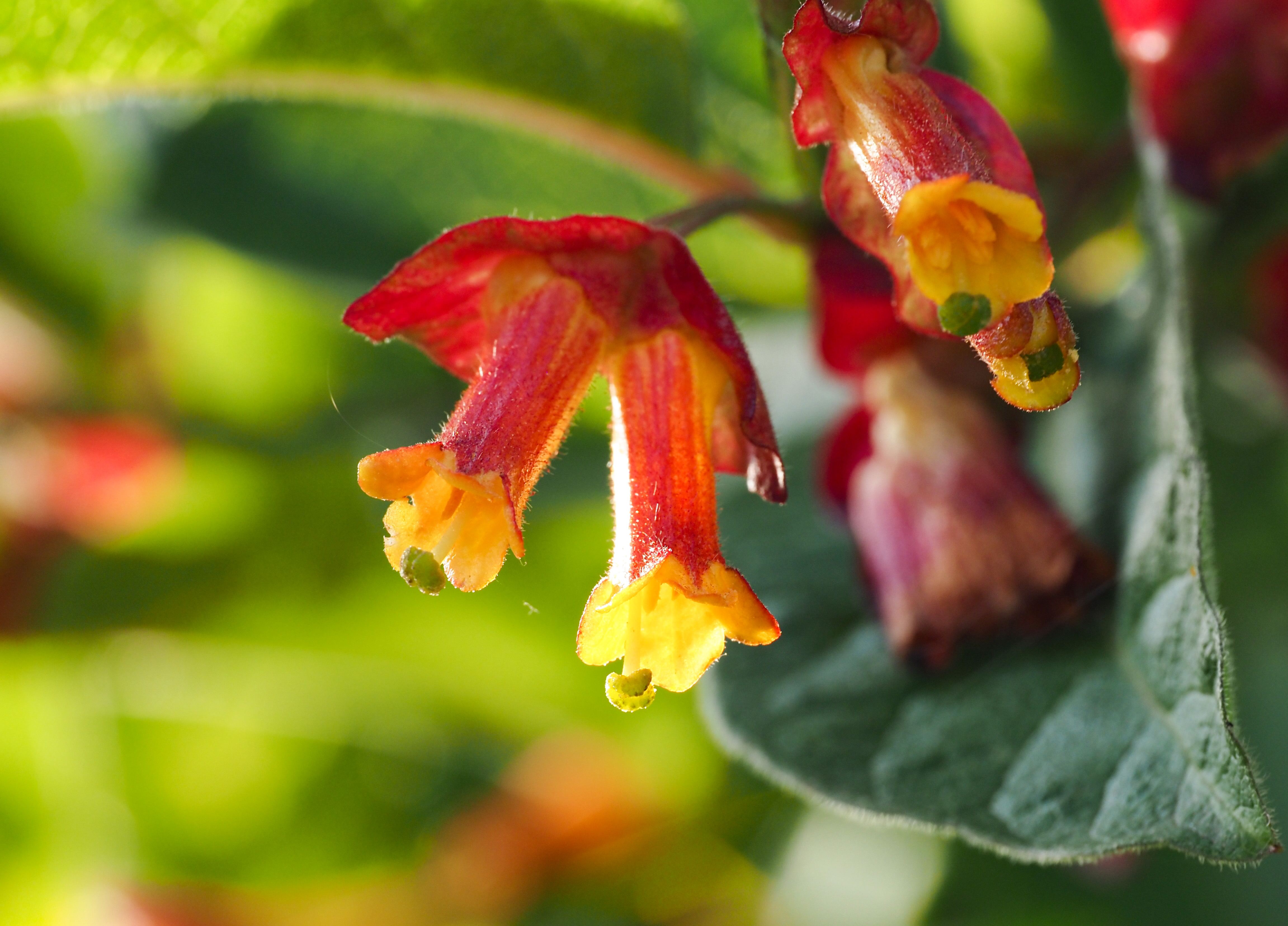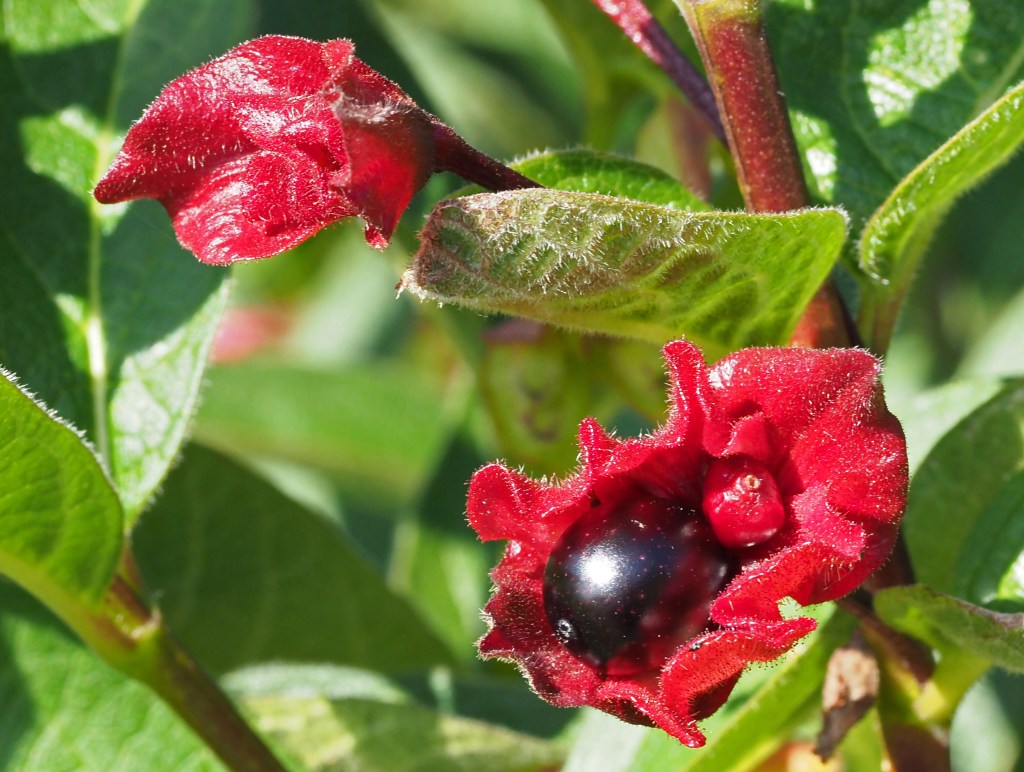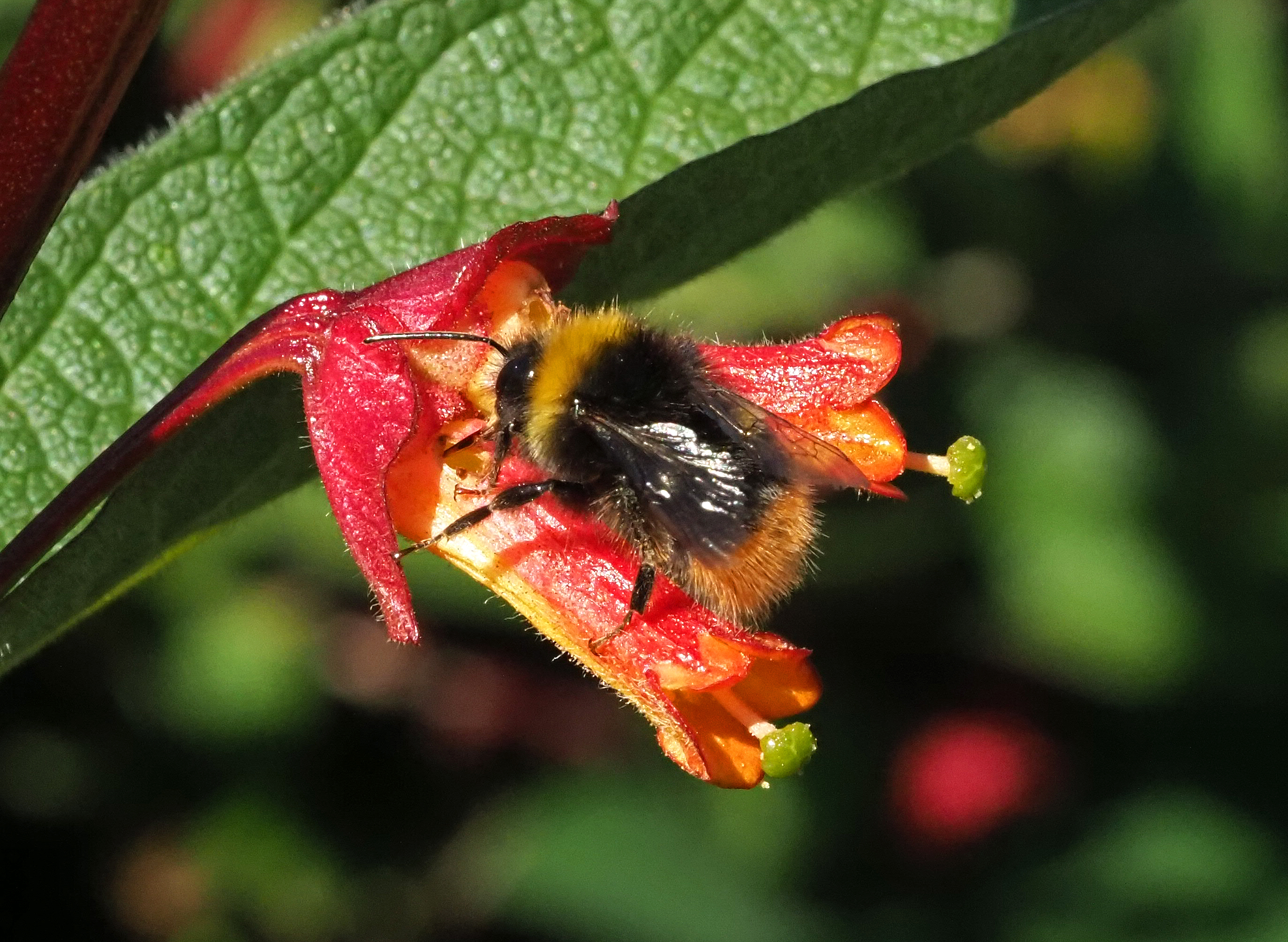 Twinberry honeysuckle, or Californian Honeysuckle (Lonicera involucrata) is a non-native, hardy shrub from North America. It is widely available in UK nurseries and garden centres and is not considered an invasive species of any concern. Native UK bumblebees seem to like it, and I regularly photograph them feeding on the flowers in June.