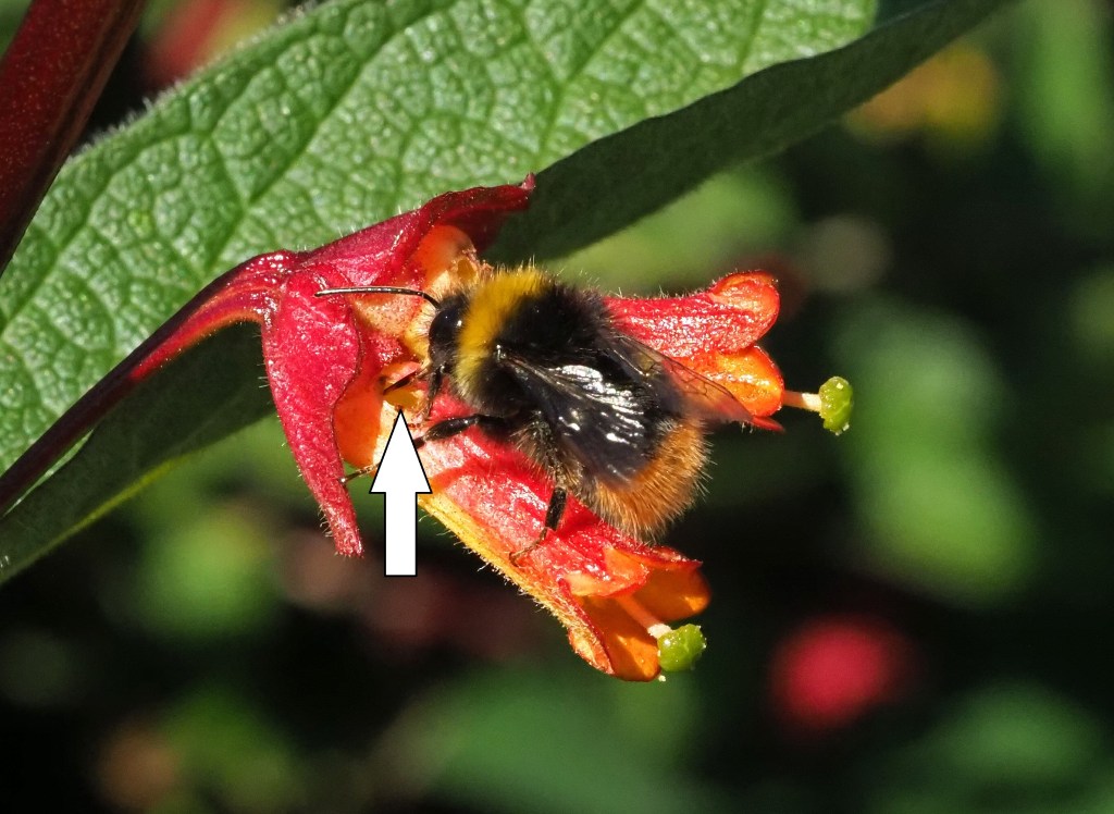 The small male and worker Early bumblebees sup nectar from holes at the base of the flower (below). I’m not sure if they actually make the holes, or whether another species – such as Bombus terrestris – chews out a hole? The flower tube (corolla) of Lonicera involucrata is nowhere near as long as that of Lonicera periclymenum, but it is still an effective barrier for some species.